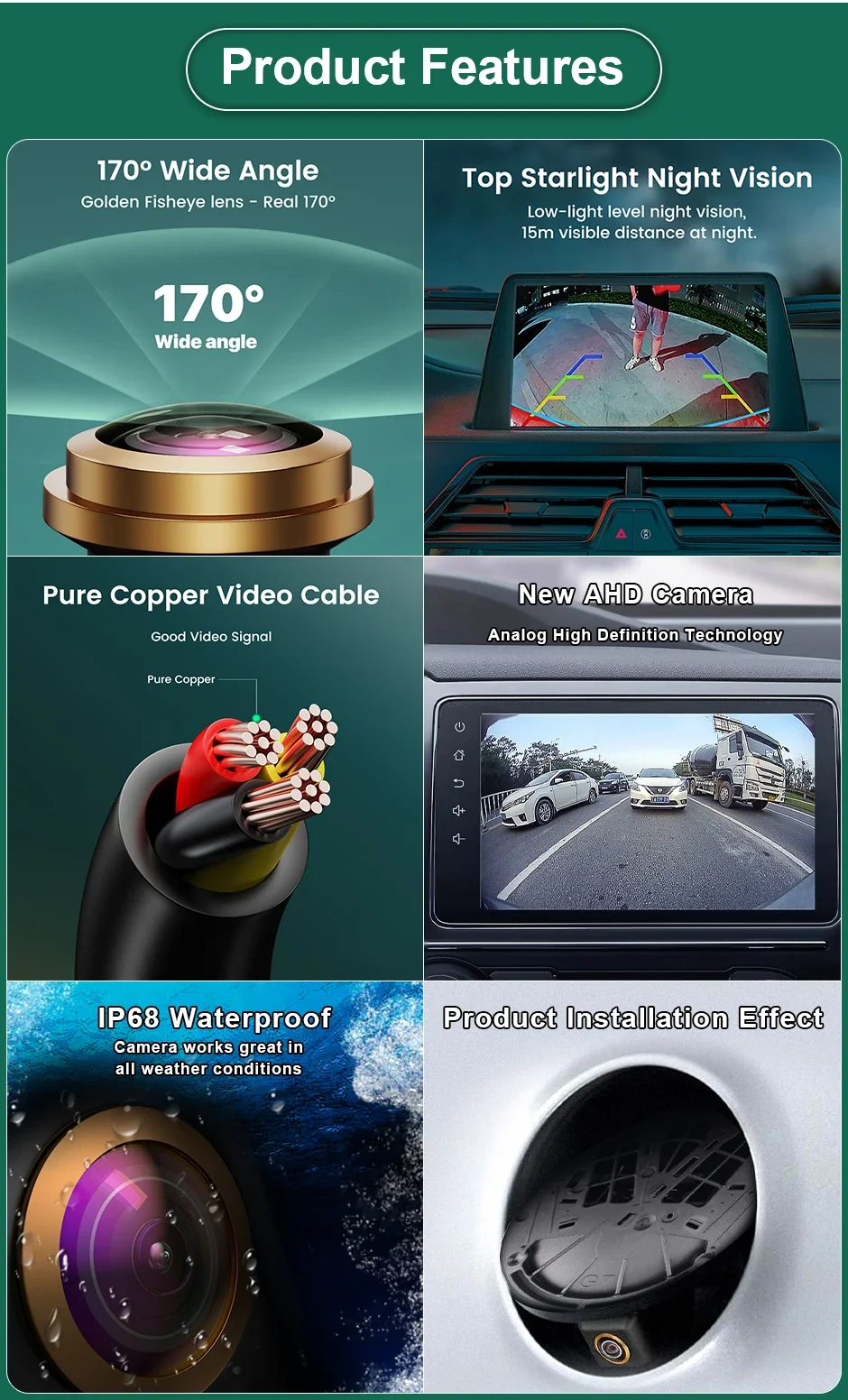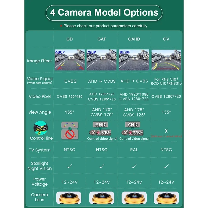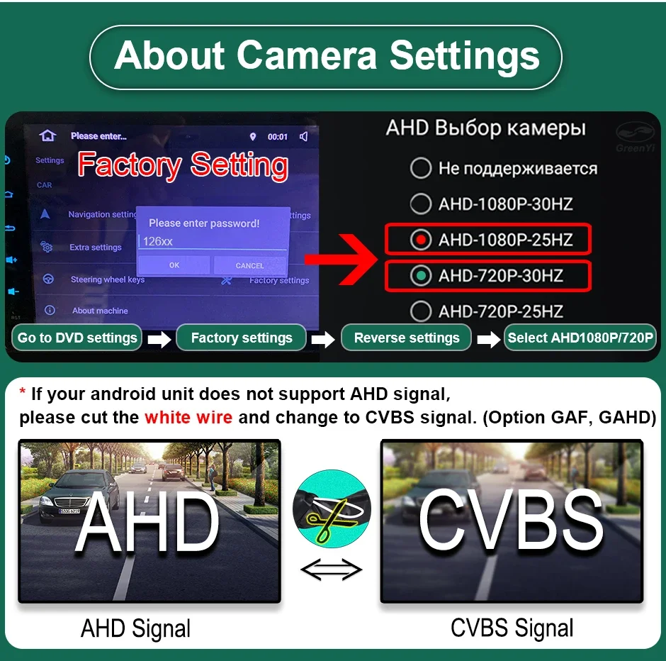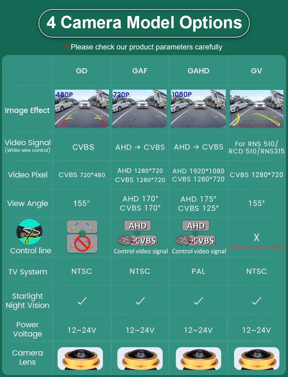 * The Camera supports both AHD and CVBS video signal, it can work with both AHD Android monitors and all CVBS TFT monitors.