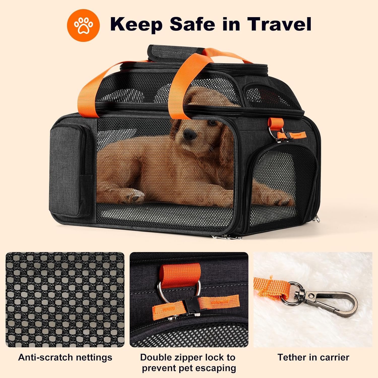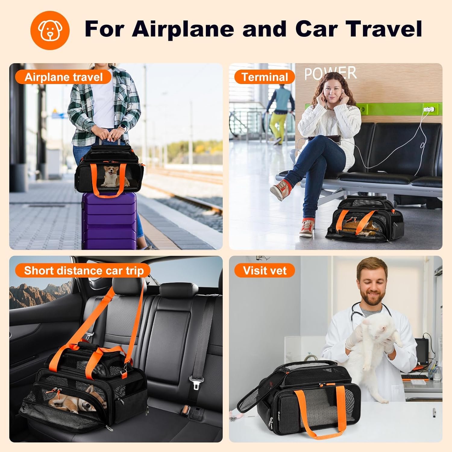 【Expandable part provide more space for your pet】 This carrier have a 3.5” height expandable top,you can fold it down to put carrier under seat in cabin and pull it up to giving more space for pet in other travel time.This carrier also have a accordion-style expandable part in side to providing more space in travel(like backseat in car,space underseat in cabin).