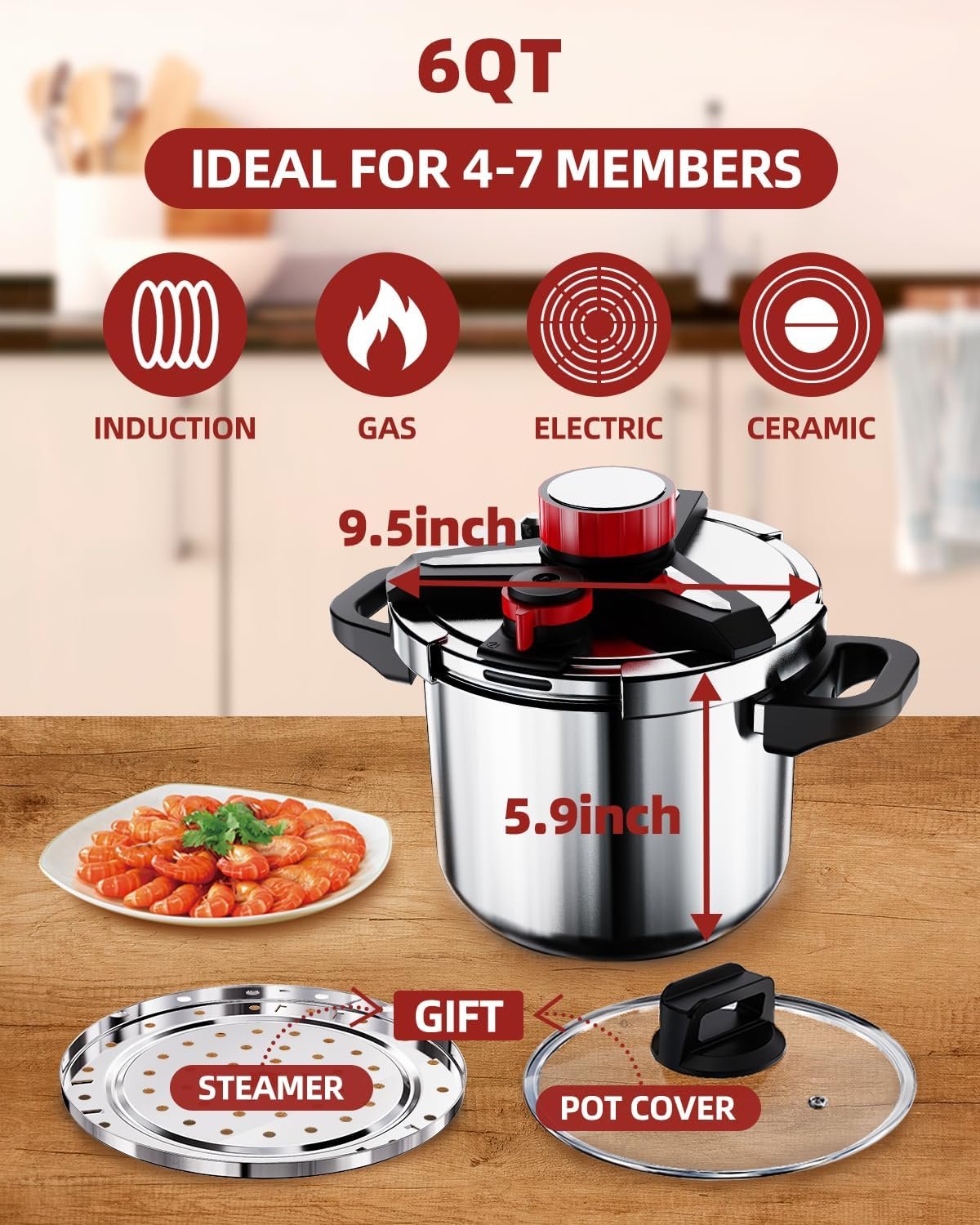 [EXTRA SAFE PRESSURE COOKER]: This 6-quart pressure cooker is designed with safety features like a secure-lock lid, safety valve, lid window, and pressure release valve, ensuring safe and worry-free cooking.