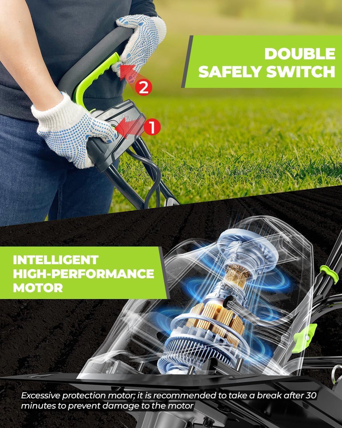 𝐒𝐀𝐅𝐄 𝐂𝐔𝐋𝐓𝐈𝐕𝐀𝐓𝐎𝐑 𝐓𝐎𝐎𝐋 Garden cultivator tool with the double safe feature, safety button, and over-temperature protection not only keep human people safe but also keep the machine safe, with a long life.