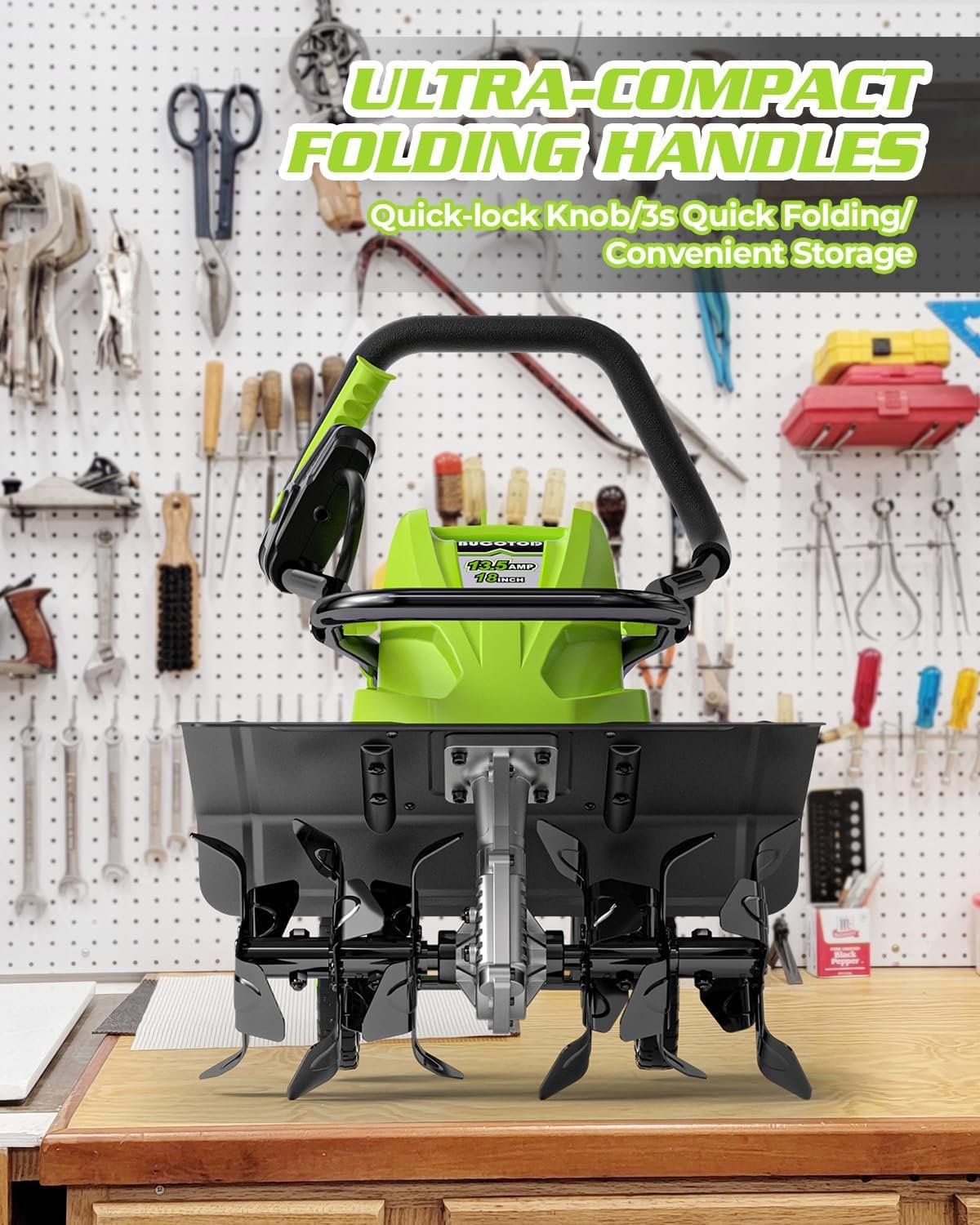 𝐅𝐎𝐋𝐃𝐀𝐁𝐋𝐄 & 𝐏𝐎𝐑𝐓𝐀𝐁𝐋𝐄 Electric rototiller with a humanized design, just press the safety button and switch while working. Weighing just 27.87 lbs, this electric cultivator tiller can be easily lifted with one hand.The foldable handle makes transportation and storage a breeze. These thoughtful details enhance its practicality, convenience, and comfort.