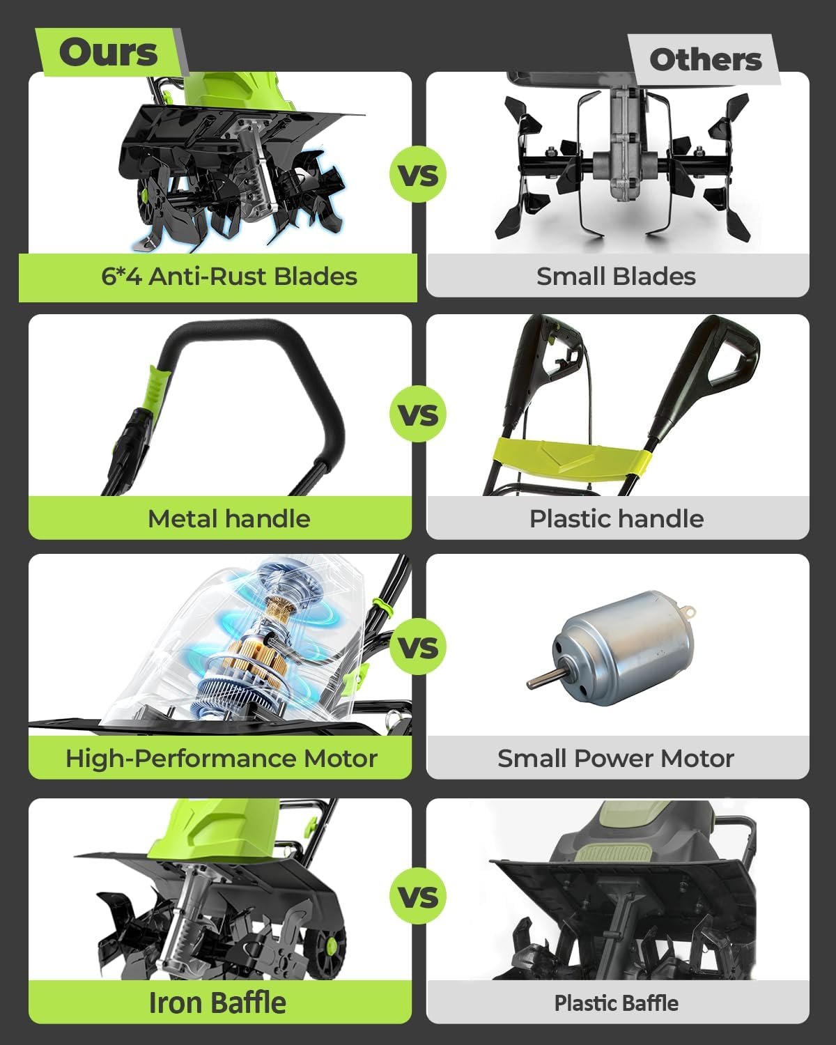 𝐒𝐓𝐀𝐁𝐋𝐄 𝐂𝐑𝐎𝐒𝐒-𝐒𝐓𝐑𝐔𝐂𝐓𝐔𝐑𝐄 𝐓𝐈𝐍𝐄𝐒 Tillers and cultivators electric is designed with 6 x 4 tines, 18-inch tilling width, 4” – 8” tilling depth. Constructed from durable 65# steel Mn, the tines feature a cross-structure design that ensures stability and ease of use in various soil conditions. It will offer more dense and faster tilling, wider working range more several times efficiency.