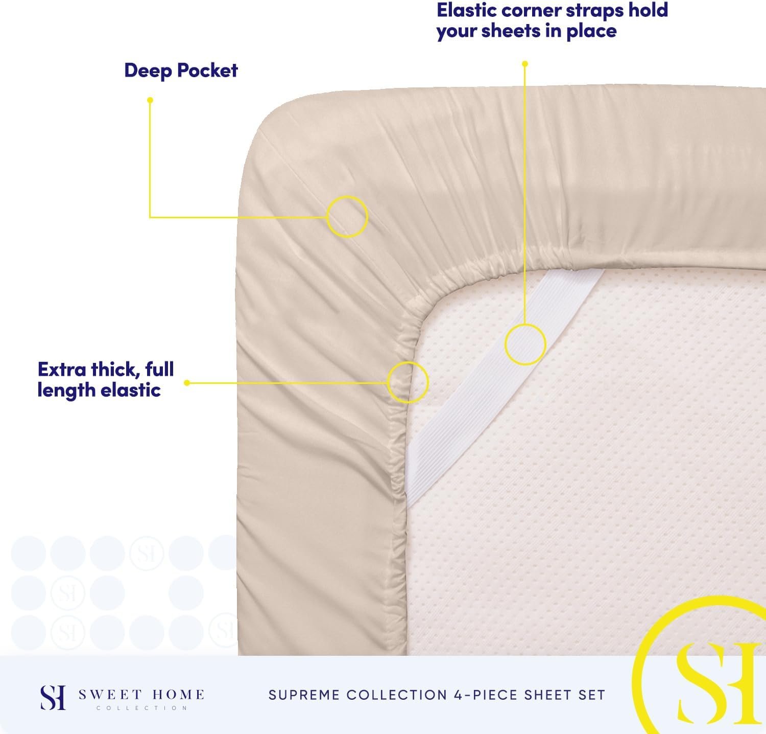 ELASTIC CORNERS BUILT IN – What separates our bed sheets from the rest are the special elastic sheet straps built in. These elastic corners keep your fitted sheet secure to the bed and come on all of our sheets.