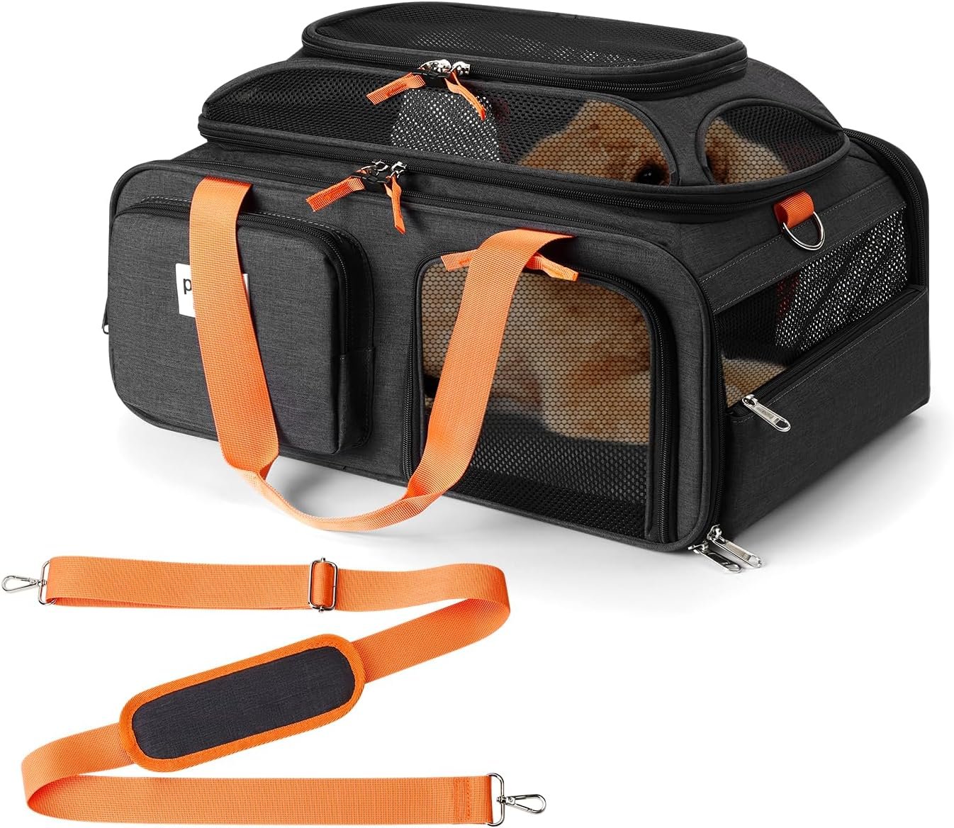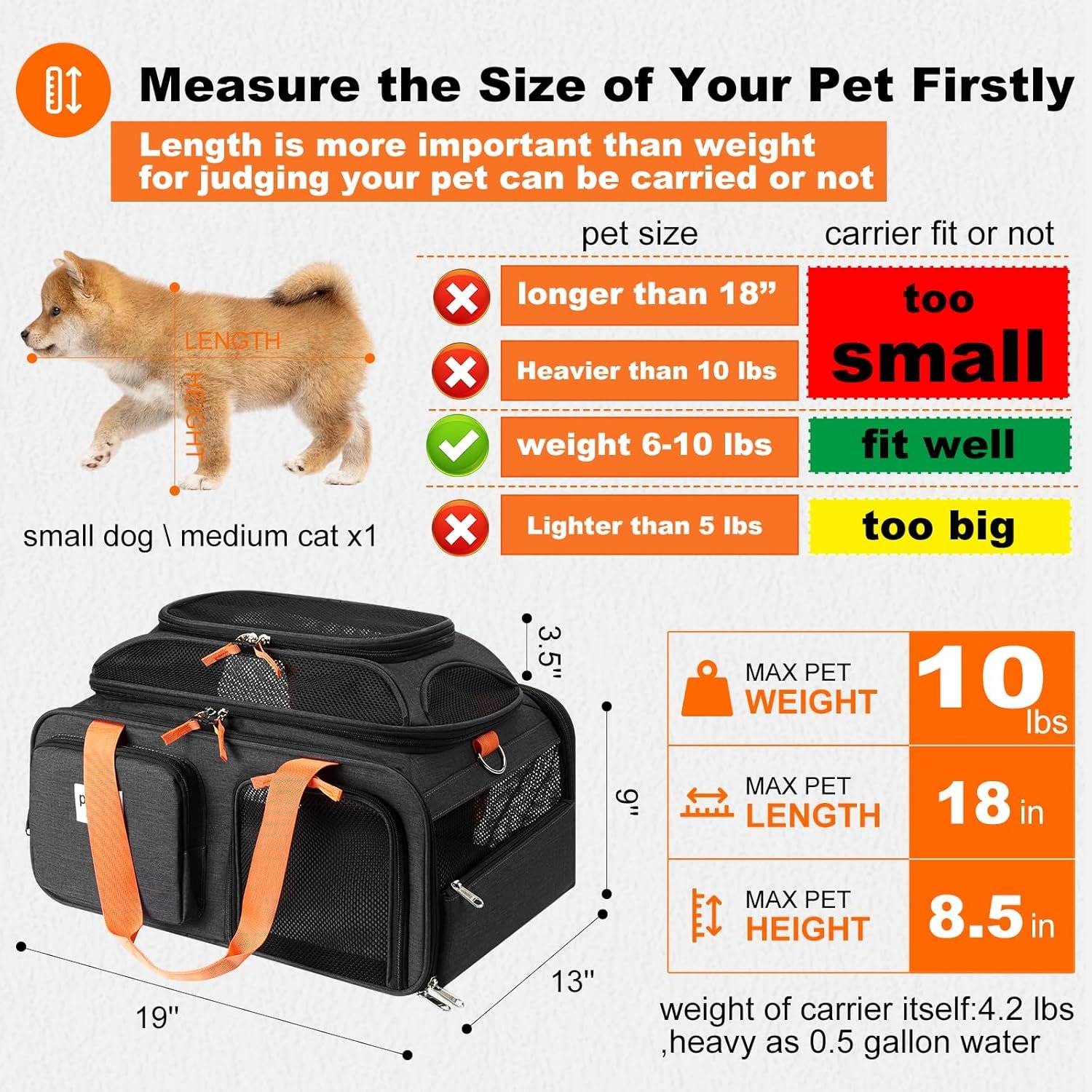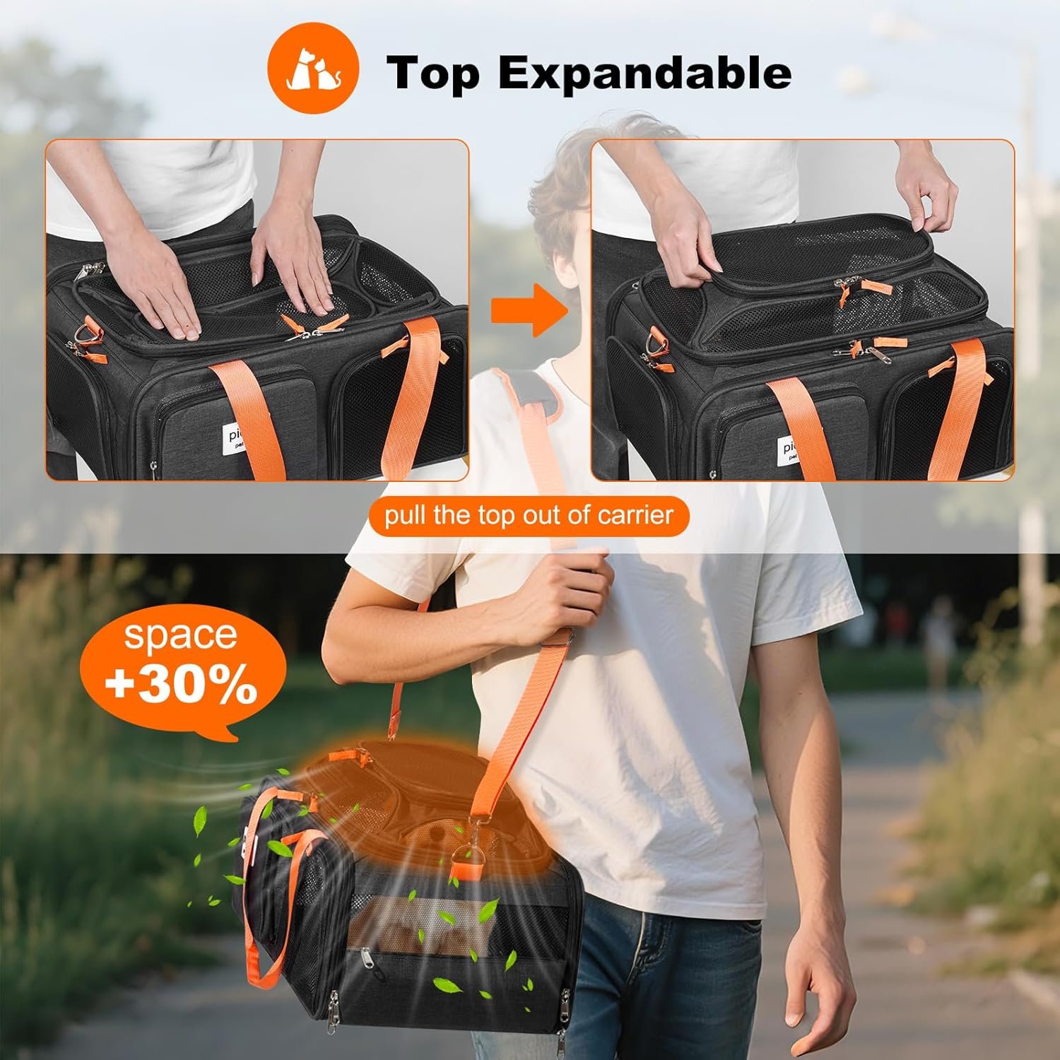 【Expandable Top provide more space for your pet】 This carrier have a 3.5” height expandable top(fully extended),you can fold it down to put carrier under seat in cabin and pull it up to giving more space for pet in other travel time.Not like other similar products, expandable top in our product have a 5 sides meshes to provide better Air mobility and 360 degrees visual field for your pet.