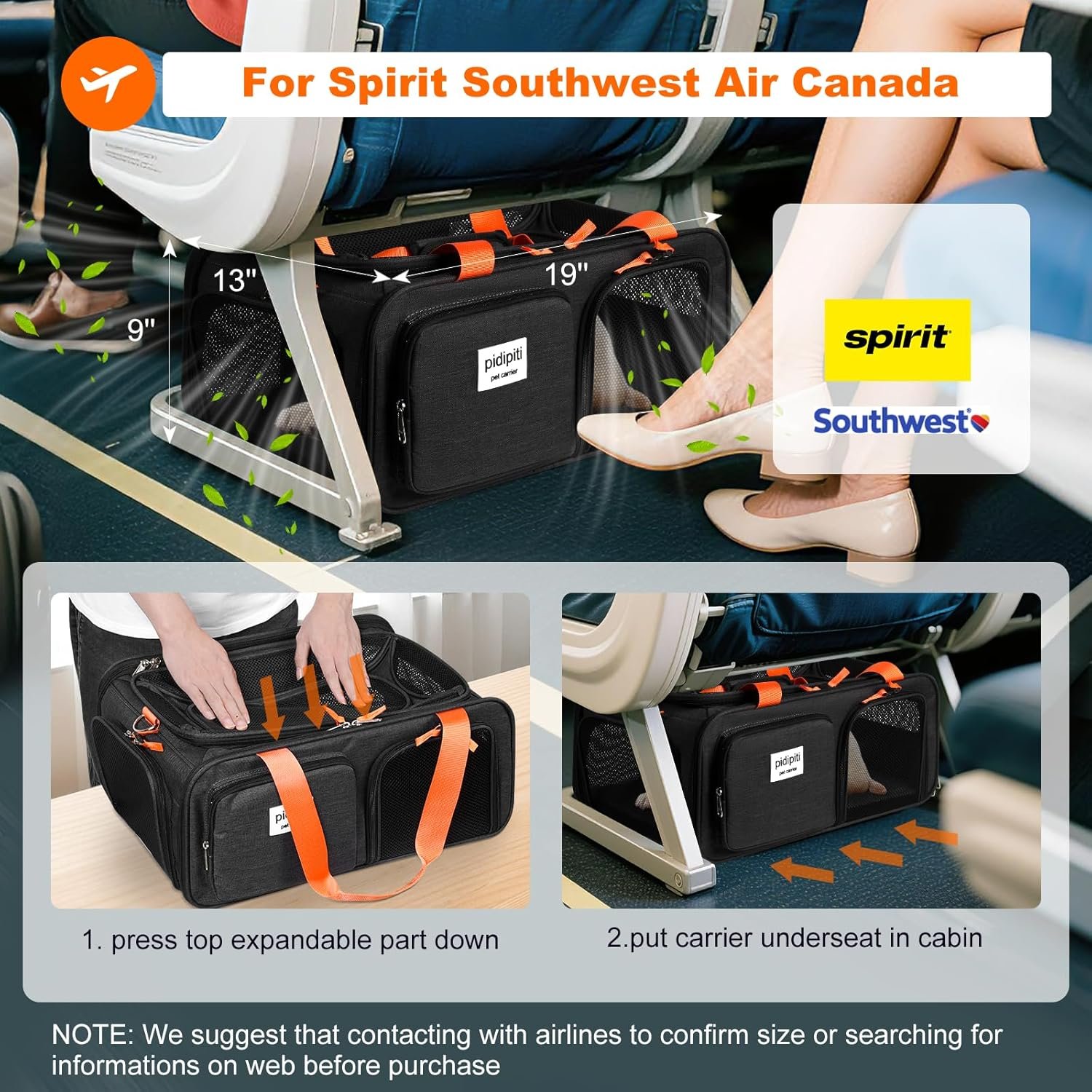 【FOR Southwest / Spirit / Air Canada】 size of carrier is 19(L) x 13(W) x 9(H),it can be putted under the seat in cabin,it match the requirement of some airlines like Air Canada.It is a bit oversize than requirement of Southwest / Spirit,but it can be underseat in their flights,and airlines will approve this carrier as a soft-sided style in most situations. IT IS NOT APPROVED BY DELTA\UNITED AMERICAN ALASKA.