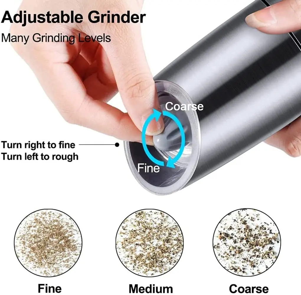 ã€Adjustable Grinder】 Many grinding levels for your choice allows you to grinder your spices from coarse to fine. Electric pepper grinder use a high-quality ceramic rotor. You can choose the coarseness of your spice, salt or pepper by turning adjustment knob at the head of the grinder.