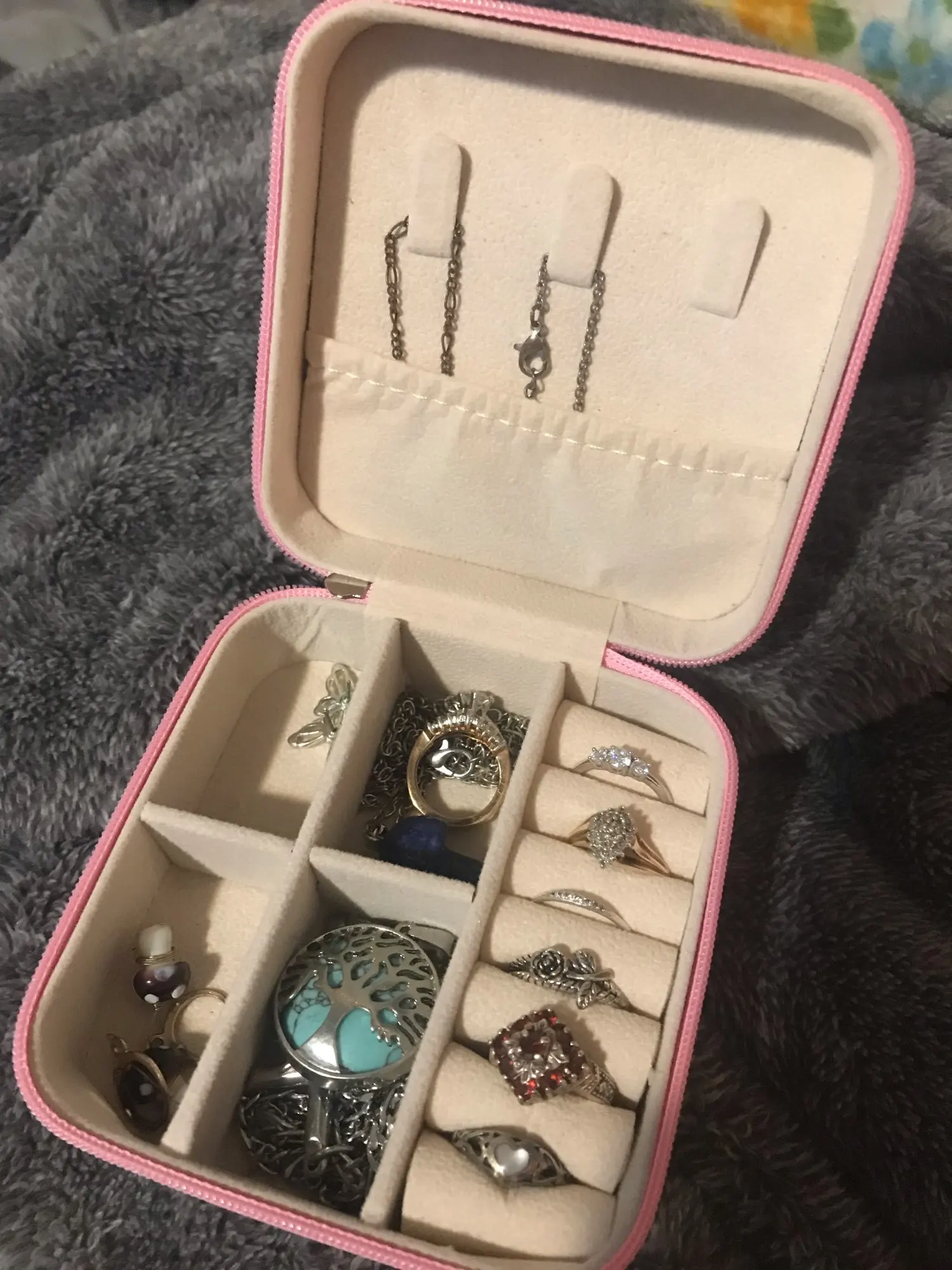 Beautiful jewelry box for storing beautiful jewelry. They look like excellent quality. I have bought lots of them for presents and as gifts when my online shop opens for people spending over a certain amount of money. They’re excellent for teens who don’t have a lot of very valuable jewelry yet, and great for brides and adults who travel for holidays or special events and want a secure zipper travel jewelry box to store their jewelry when they go to sleep. Excellent quality and i love them!