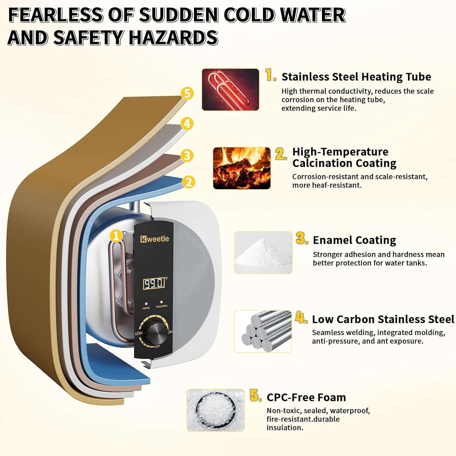 【Efficient Insulation & Energy】Our mini tank water heater adopts seamless welding technology and a high-quality heating tube, higher energy efficiency, providing hot water on demand, effectively reducing energy waste. The interior is filled with fluorine-free polyurethane. Effectively improving insulation effect, fearless of sudden cold water.
