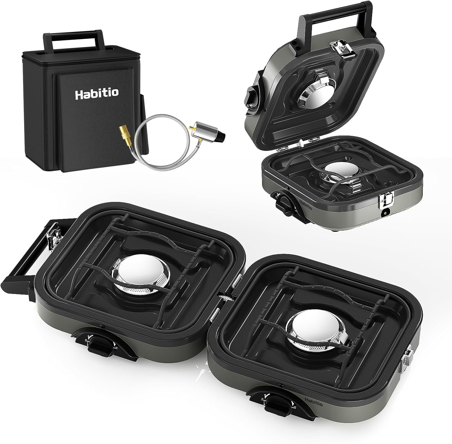 Foldable Design: The folding size of the Habitio camping stove is only 10.5*8.5*5.1 inches, and weighs 5 lbs; It features a carrying bag that can store all accessories and propane tank, which is very suitable for storage and carrying, make your camping more convenient