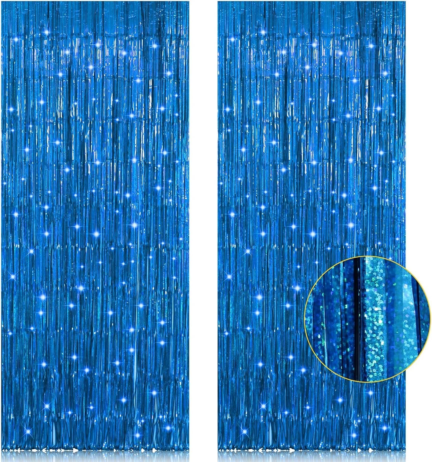 2 Pack 3.2ft x 8.2ft Blue Foil Fringe Curtains Photo Backdrop Party Decorations, Metallic Tinsel Foil Fringe Streamer Curtain for Party Door Wall Curtain Bachelorette Christmas New Year Decorations