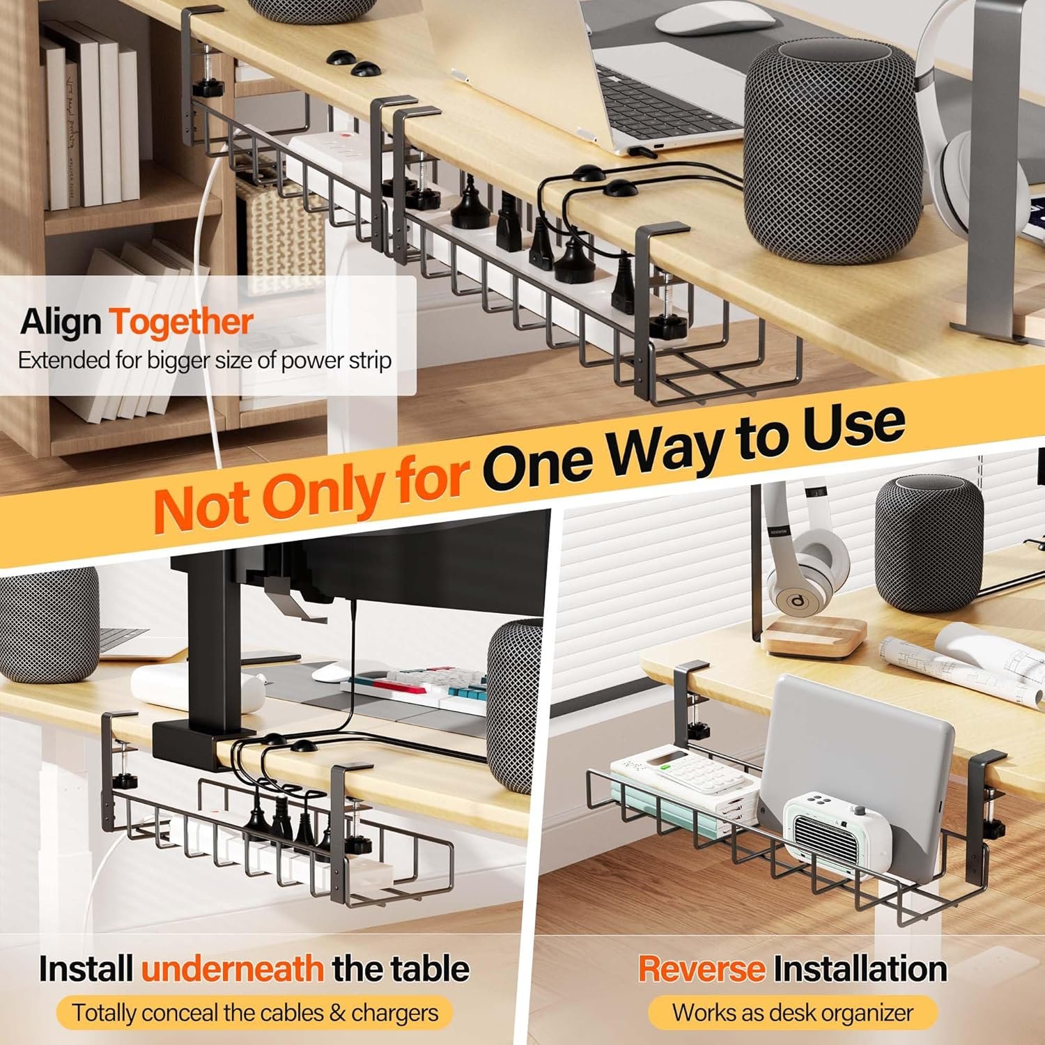 👍【What You Will Get 】Great value under table cable management kit contains 2 cable trays, 4 cable clips and 4 cable ties. When you place 2 racks align, you will have a extra long 31.4″ under desk cable management tray. Suitable for long power strips and multiple devices. This computer cord organizer is great for you not only around your desk table, but also good to be used in the kitchen and outdoors. Tidy and beautify your office and home.