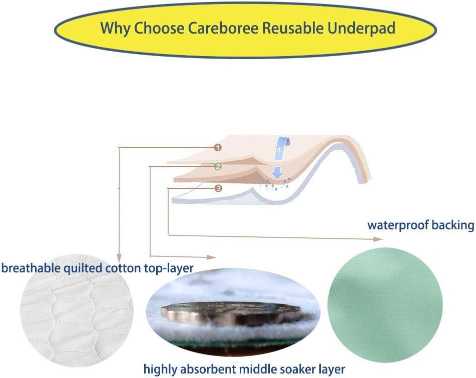 Sizes for all Beds: 34 x 36 ” is designed for twin sized mattresses and hospital beds, 34 X 52 ” is ideal for full sized mattresses, while 36 X 60 ” fits queen, and king sized mattresses.Stays in Place: Heavy-duty to keep bed pads securely in place when re-positioning or moving around.No noise: Quilted cotton top-layer, make no noise when moving around on it.Comfortable: Cotton surface, won’t irritate skin. Fabric mattress pad with moisture-wicking properties keeps bed sheets dry all night.Washable and Durable: Careboree cloth bed pad is durable, made to last up to 300 washings.Multipurpose: Use as incontinence bed pad, period bed pads for women, doggy pads, pee pads, urine pads, training pads, bed wetting pads ,chair pad, period bed pads for women.Soft, highly absorbent