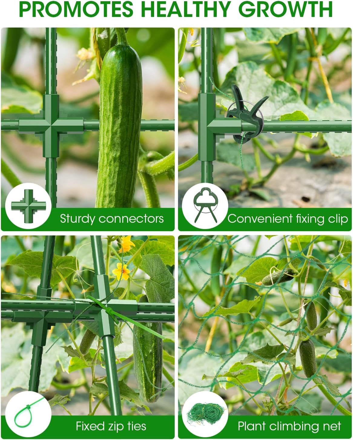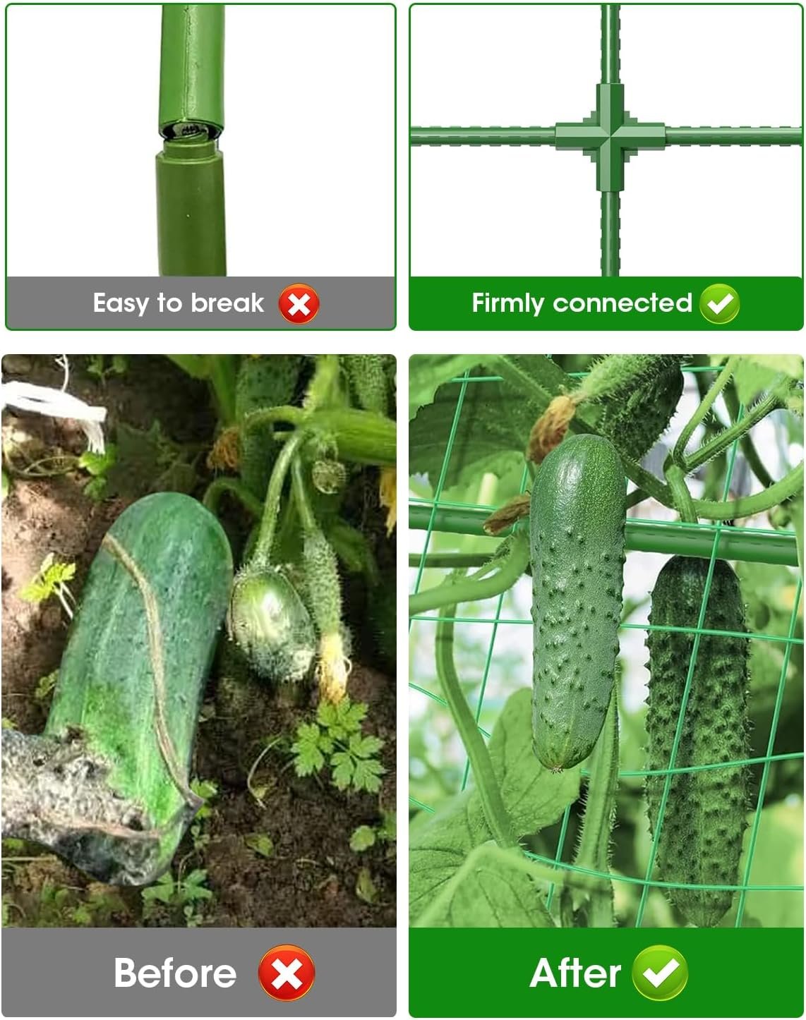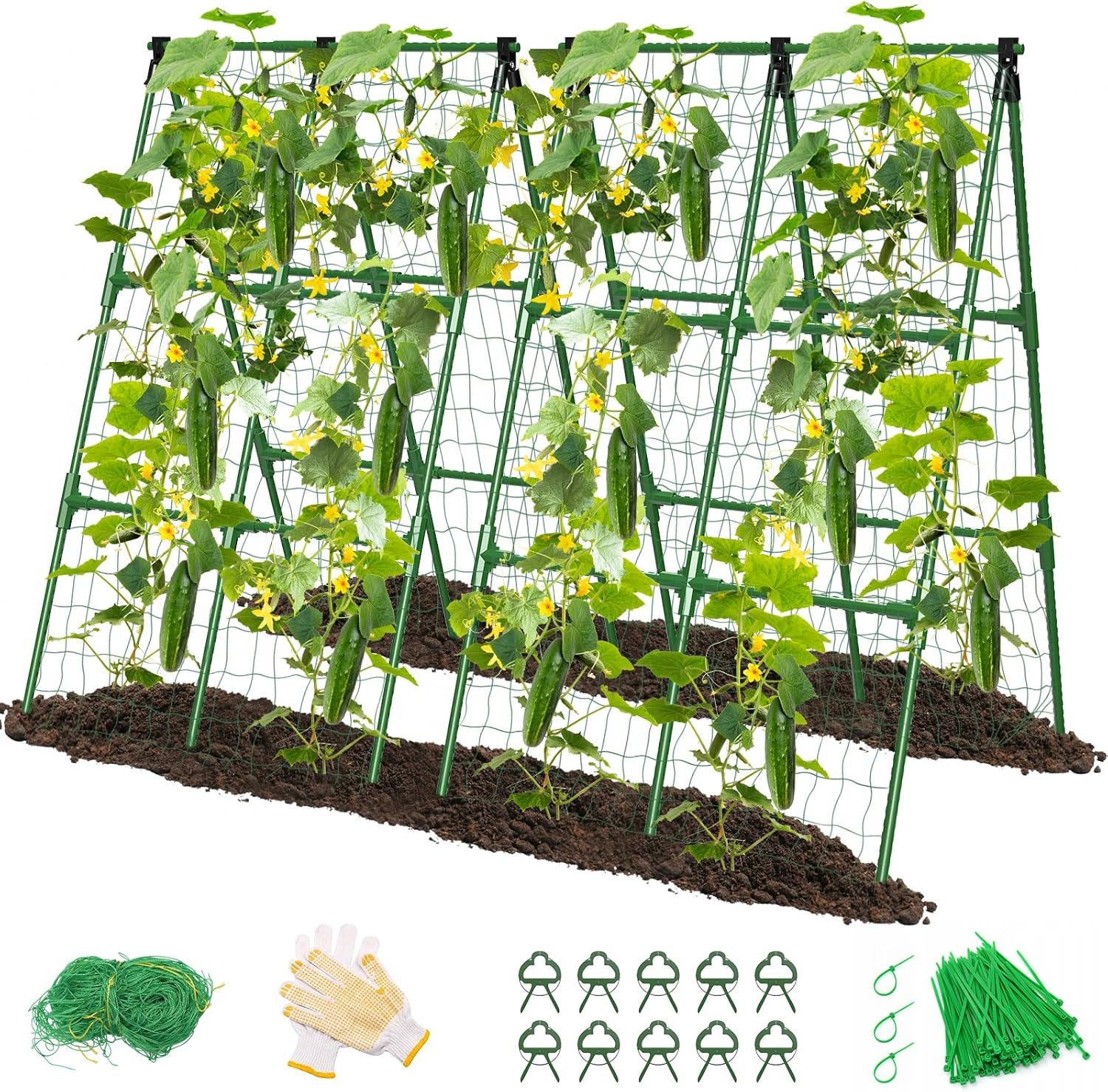 【Durable and Sturdy】The Cucumber Trellis Set features an upgraded thickened tube diameter and a triangular frame that provides exceptional support and stability, capable of withstanding up to 28 lbs of weight; This robust design ensures that your climbing plants thrive from seedlings to maturity, making it the perfect Garden Trellis for Climbing Plant Outdoor