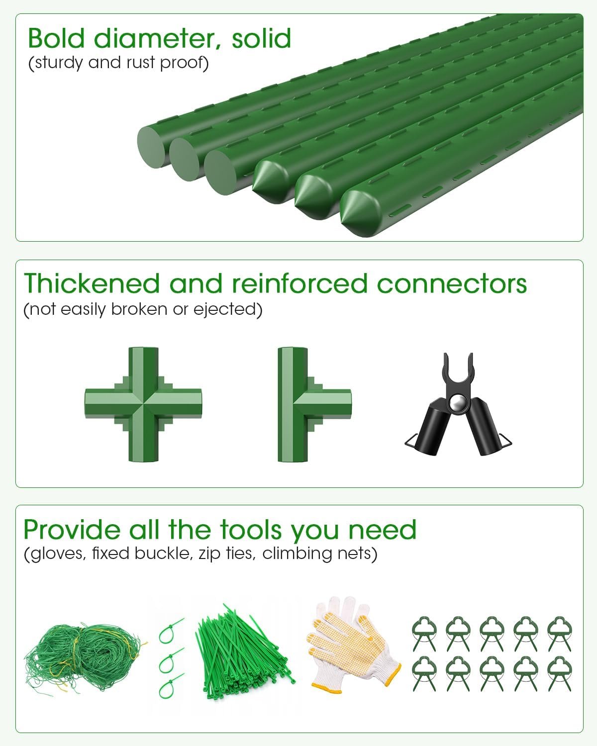 【Rustproof Garden Trellis Frame】 Unlike traditional metal cucumber trellis, our Cucumber Trellis for Raised Bed is made from high-quality plastic-coated steel pipes, featuring a thicker 0.43-inch diameter; With a weatherproof, rust-resistant surface coating, this durable trellis is designed for long-term use, protecting your plants from burn damage