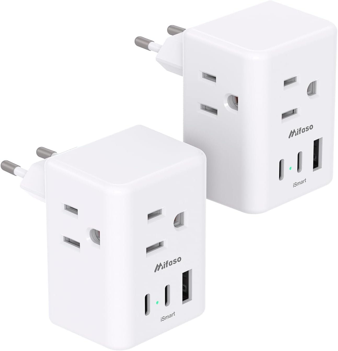 2 Pack European Travel Plug Adapter, Mifaso International Power Plug Adapter with 3 Outlets 3 USB Charging Ports(2 USB C), Type C Plug Adapter Europe Travel Essentials to Spain Italy France