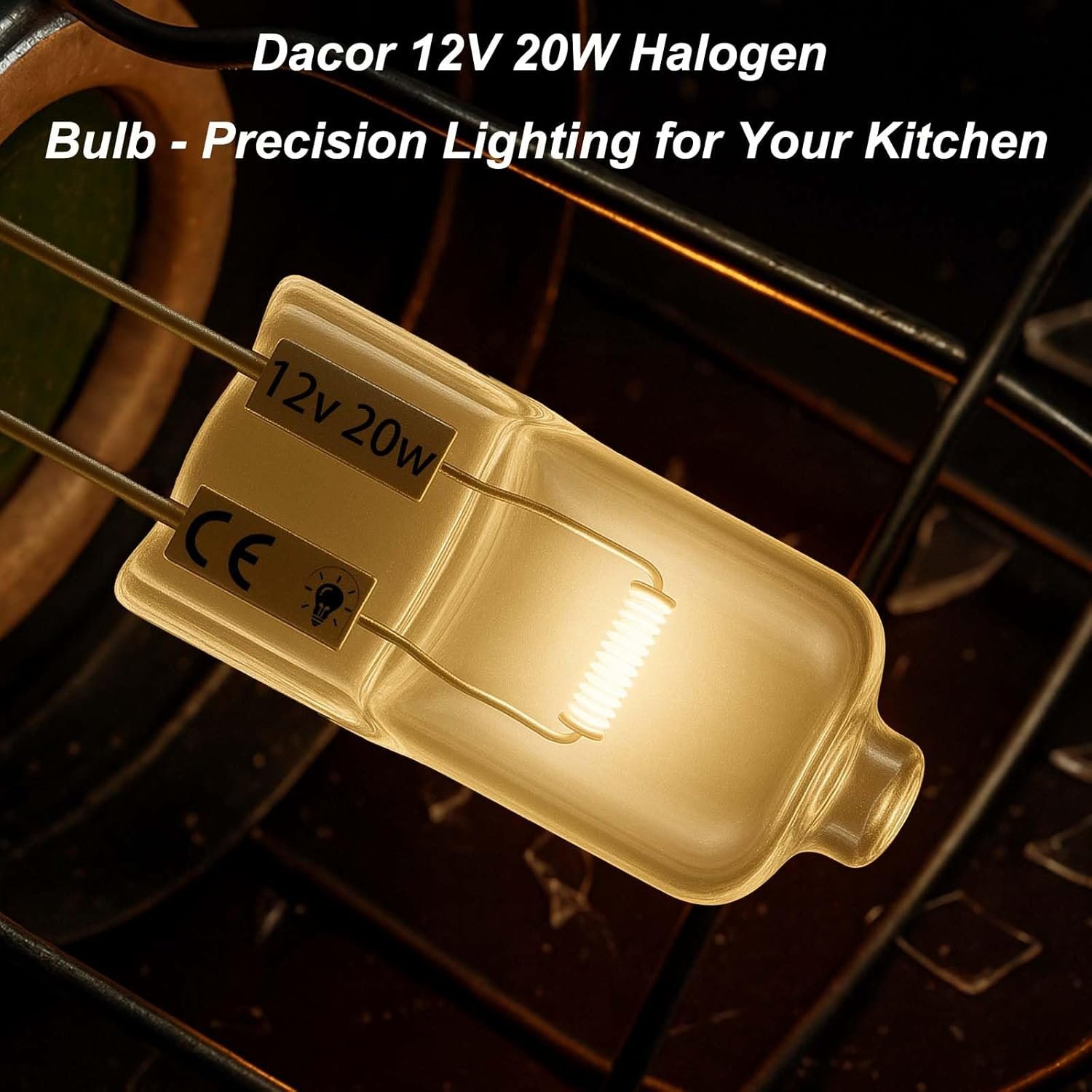 Product Specifications:12V, 20W halogen bulbs deliver bright, energy-efficient lighting for your Dacor appliance.The G4 base design features precisely spaced 4mm prongs, ensuring a secure and stable connection for safe use in your kitchen