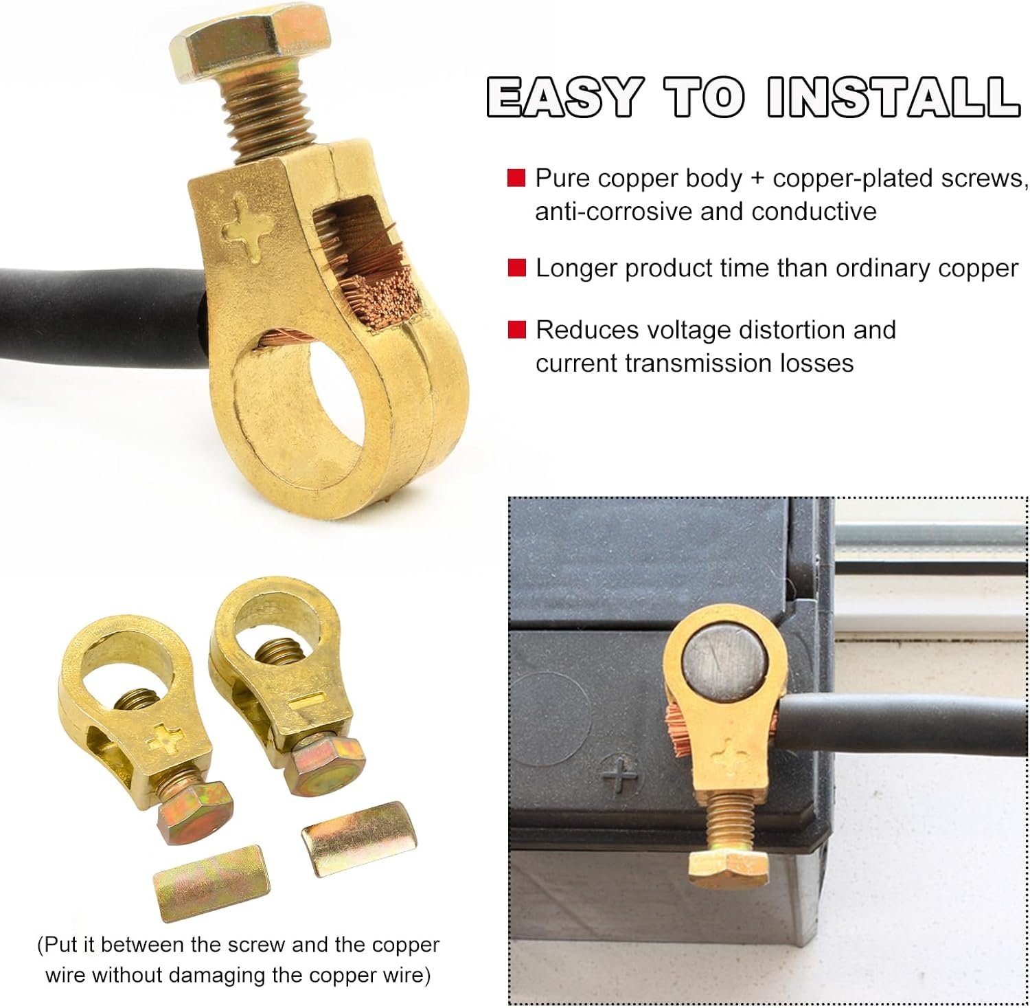 【Superior Material】: Our car battery terminal connector clamps are made of high quality copper. Copper is corrosion and rust resistant and can withstand all kinds of weather and temperature changes. And it is extremely conductive, which is safer and more stable than ordinary materials.
