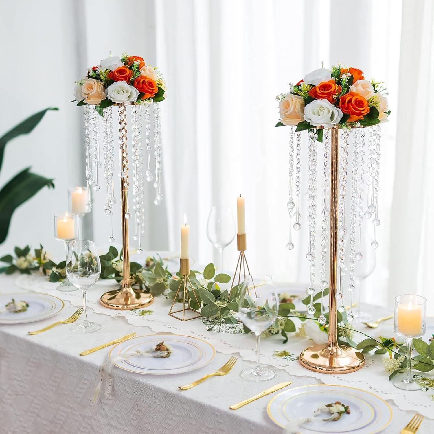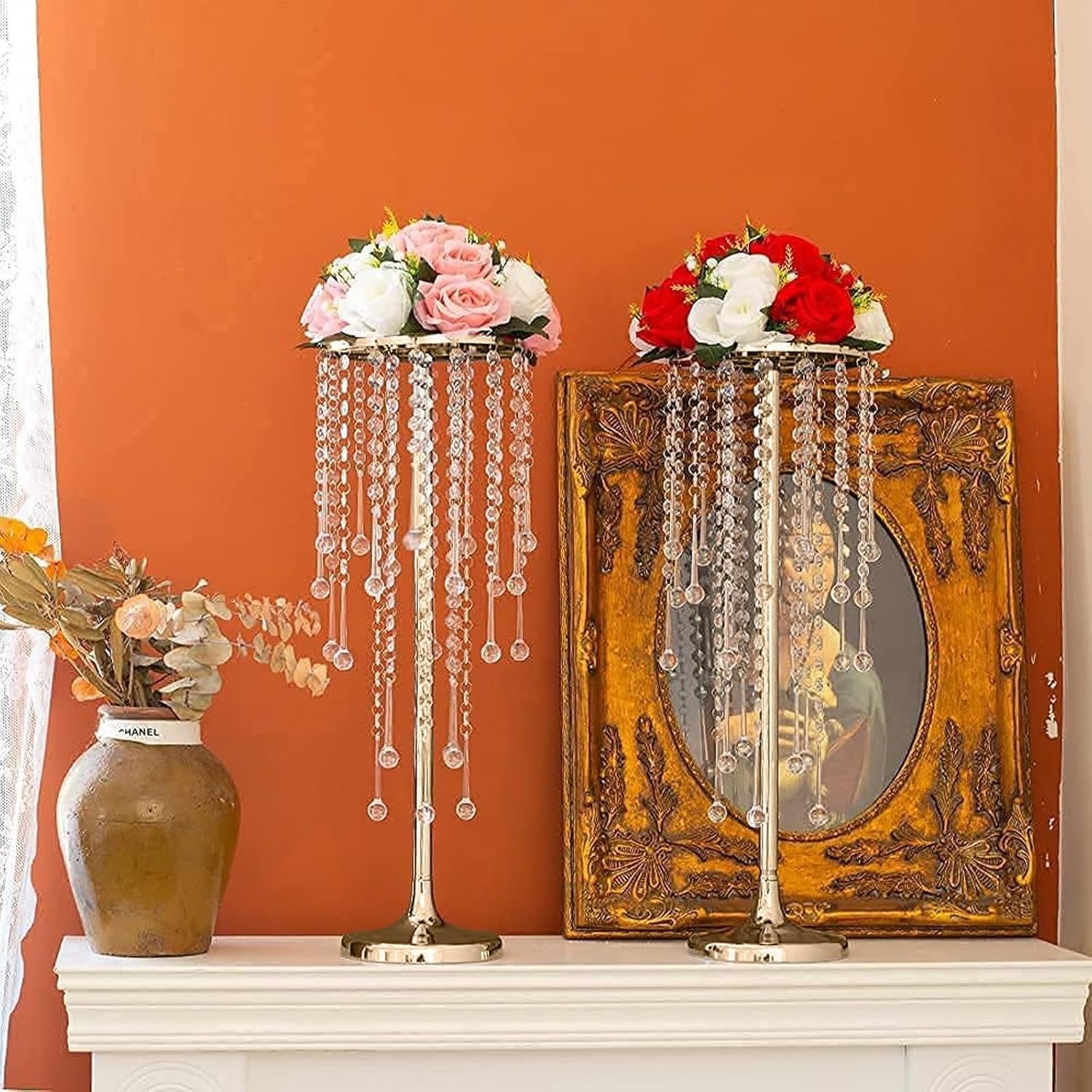 High-Quality Material: Crafted from high-quality, electroplated iron, these acrylic crystals flower stands are built to last. The sturdy metal construction ensures stability and durability, The combination of shimmering acrylic crystals and sleek gold metal creates a captivating centerpiece that complements any decor style.