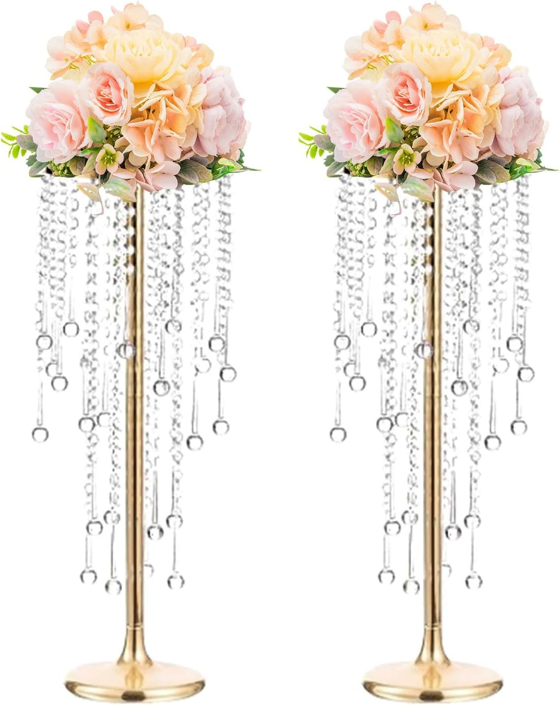 2 Pcs Crystal Flower Stand Wedding Centerpieces for Tables, 21.7 in Tall Tabletop Gold Metal Flower Arrangement Holder, Elegant Bulk Metal Vases for Wedding Party Event Reception, Birthday