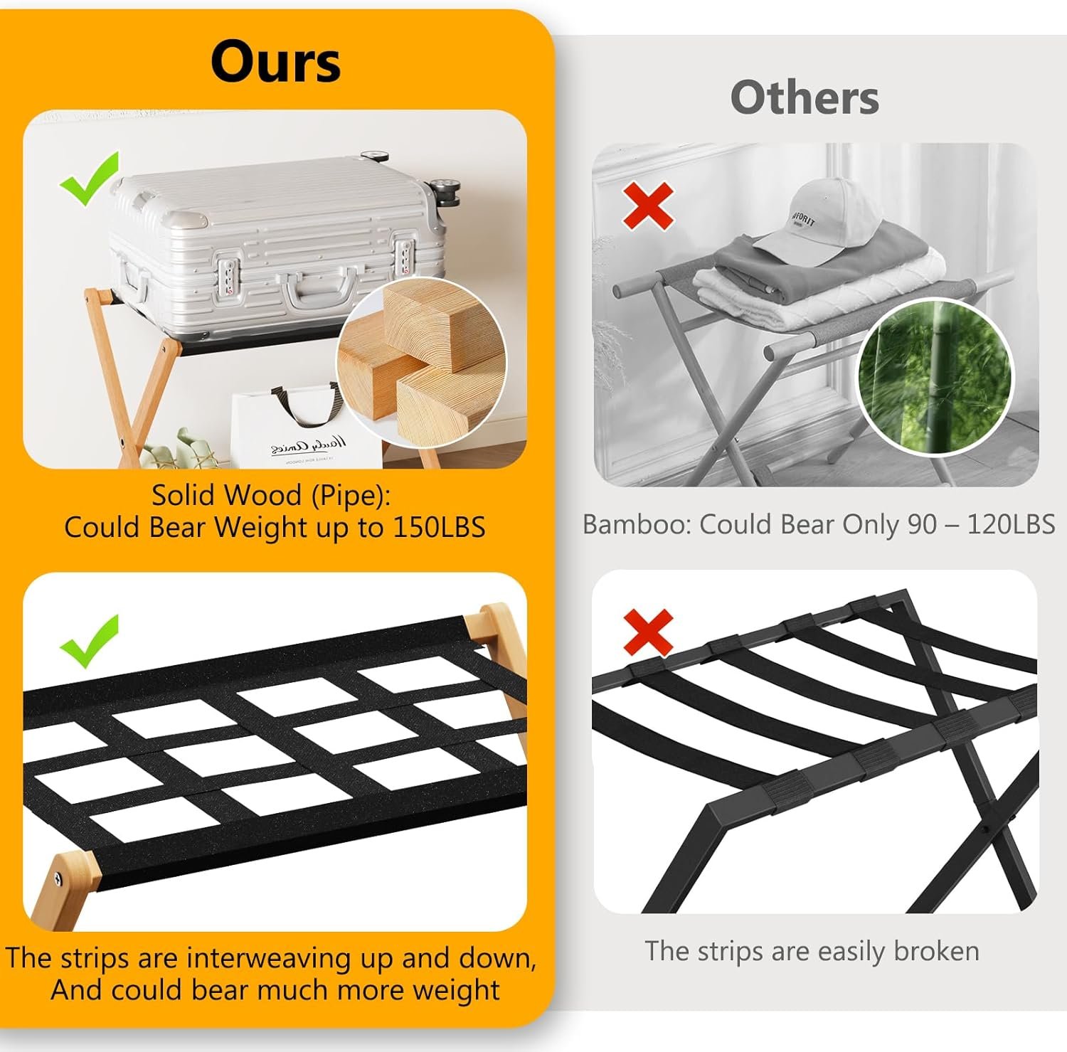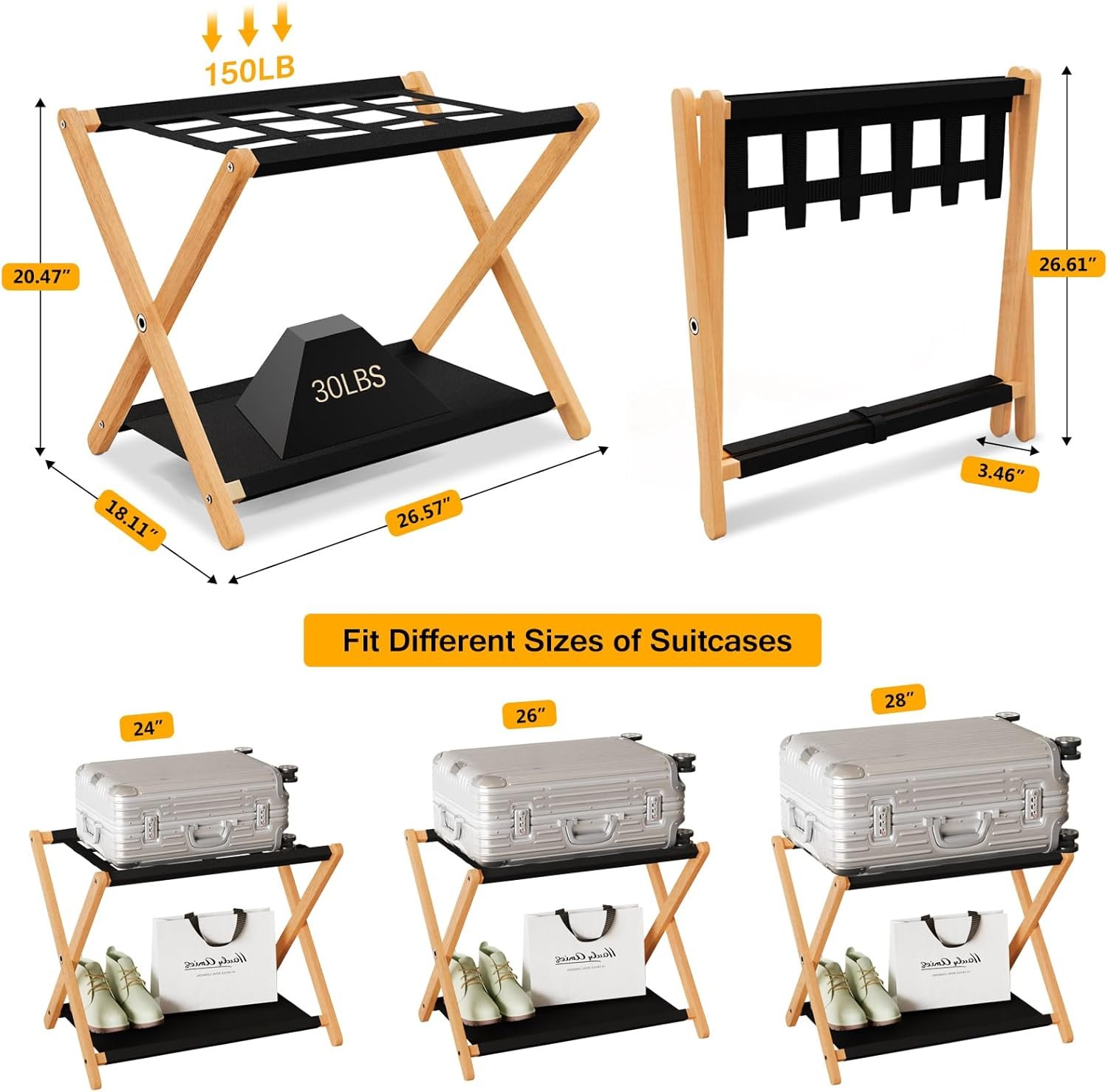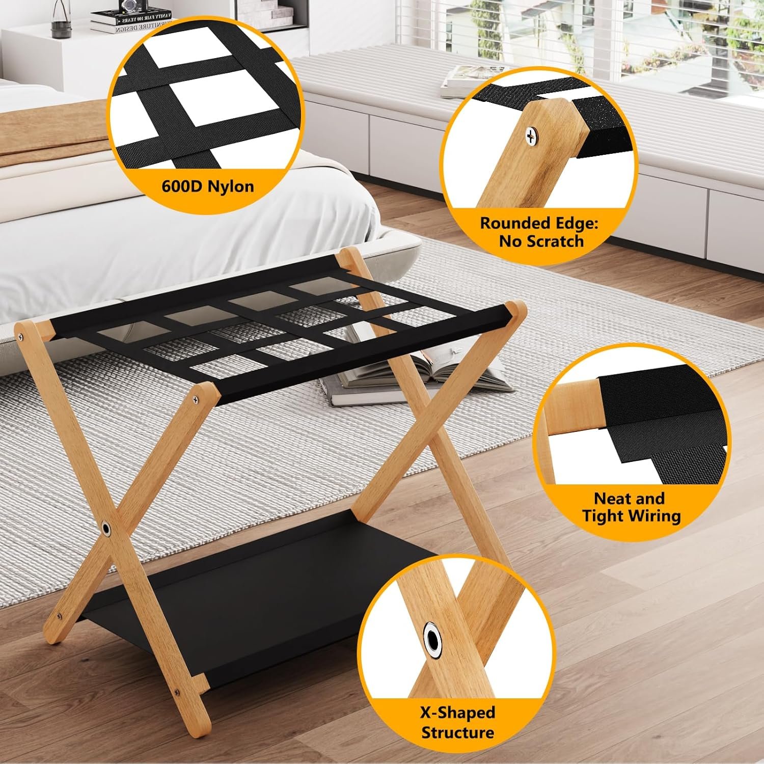 Sturdy and Stylish: Made with 100% solid wood (pine) and 600D heavy-duty nylon straps, it supports up to 150 LBS on top shelf and 30 LBS for lower shelf; This luggage rack for guest room offers a sturdy construction that can support heavy suitcases while adding a touch of sleek style to your guest room décor