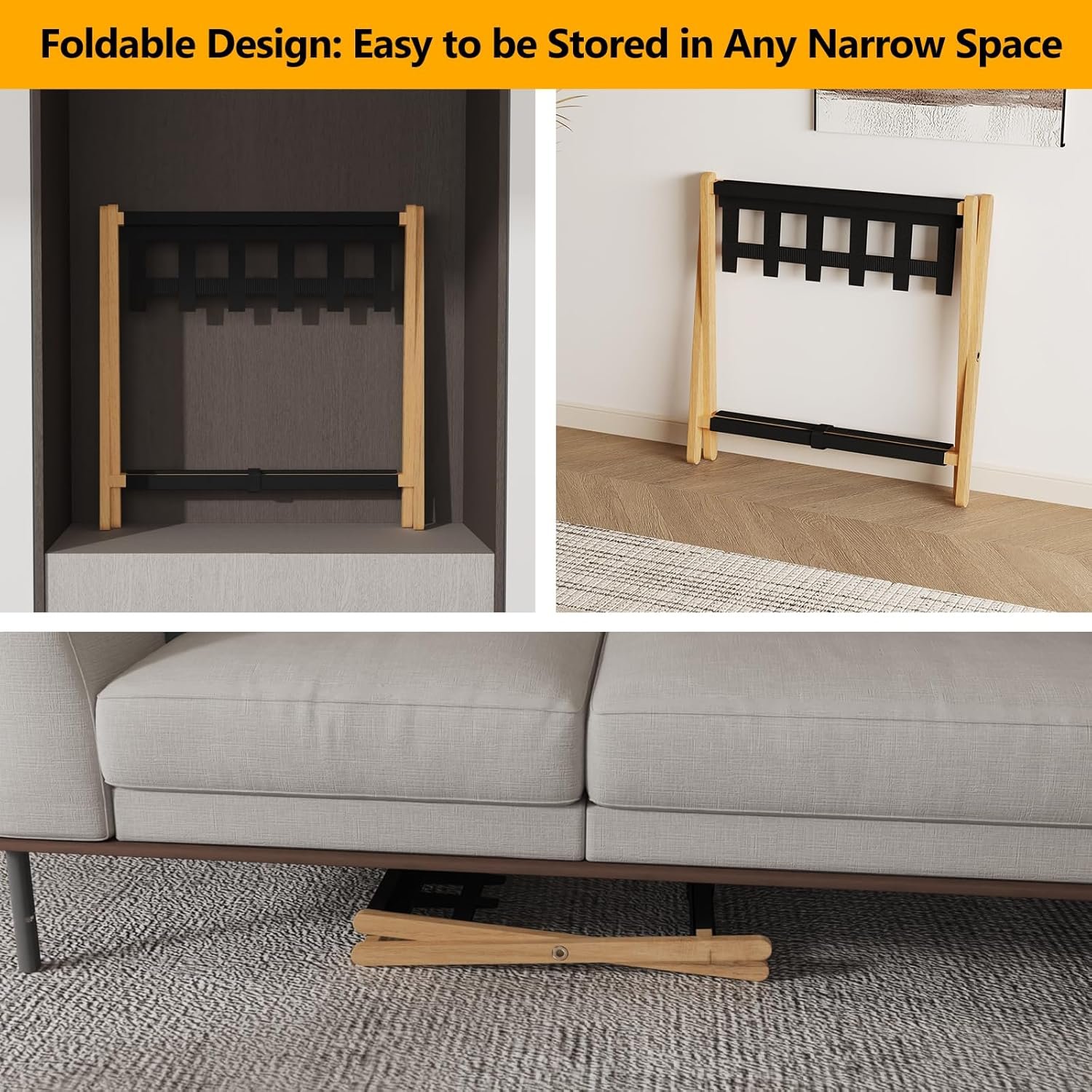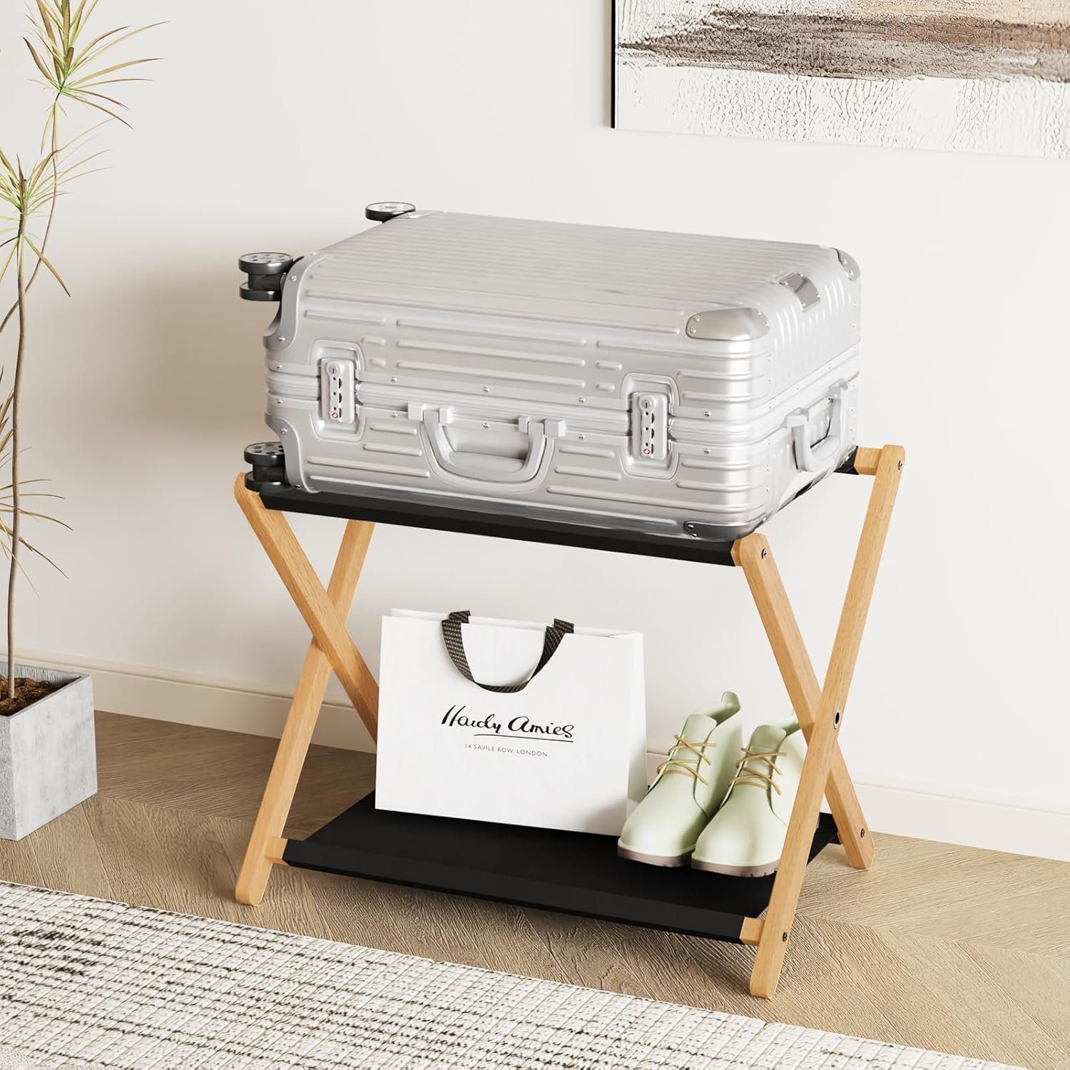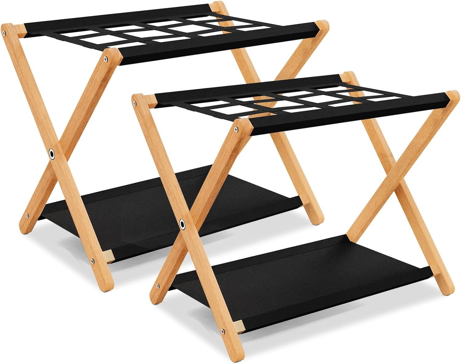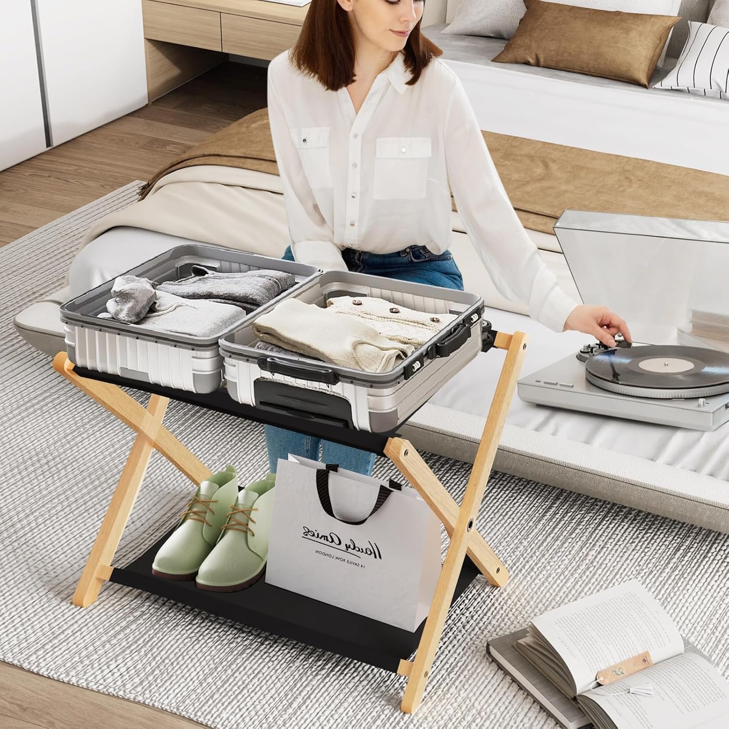Sturdy and Stylish: Made with 100% solid wood (pine) and 600D heavy-duty nylon straps, it supports up to 150 LBS on top shelf and 30 LBS for lower shelf; This luggage rack for guest room offers a sturdy construction that can support heavy suitcases while adding a touch of sleek style to your guest room décor