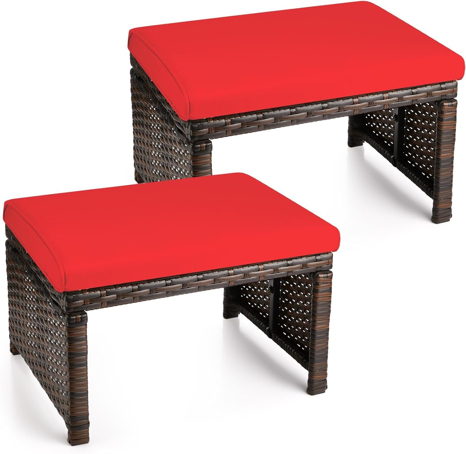 2 Pcs Patio Rattan Ottomans Outdoor Wicker Ottomans Patio Footstool Footrest with Removable Cushion Soft Zippered Cushions Footstool Seat Table for Backyard Balcony Poolside (Red)