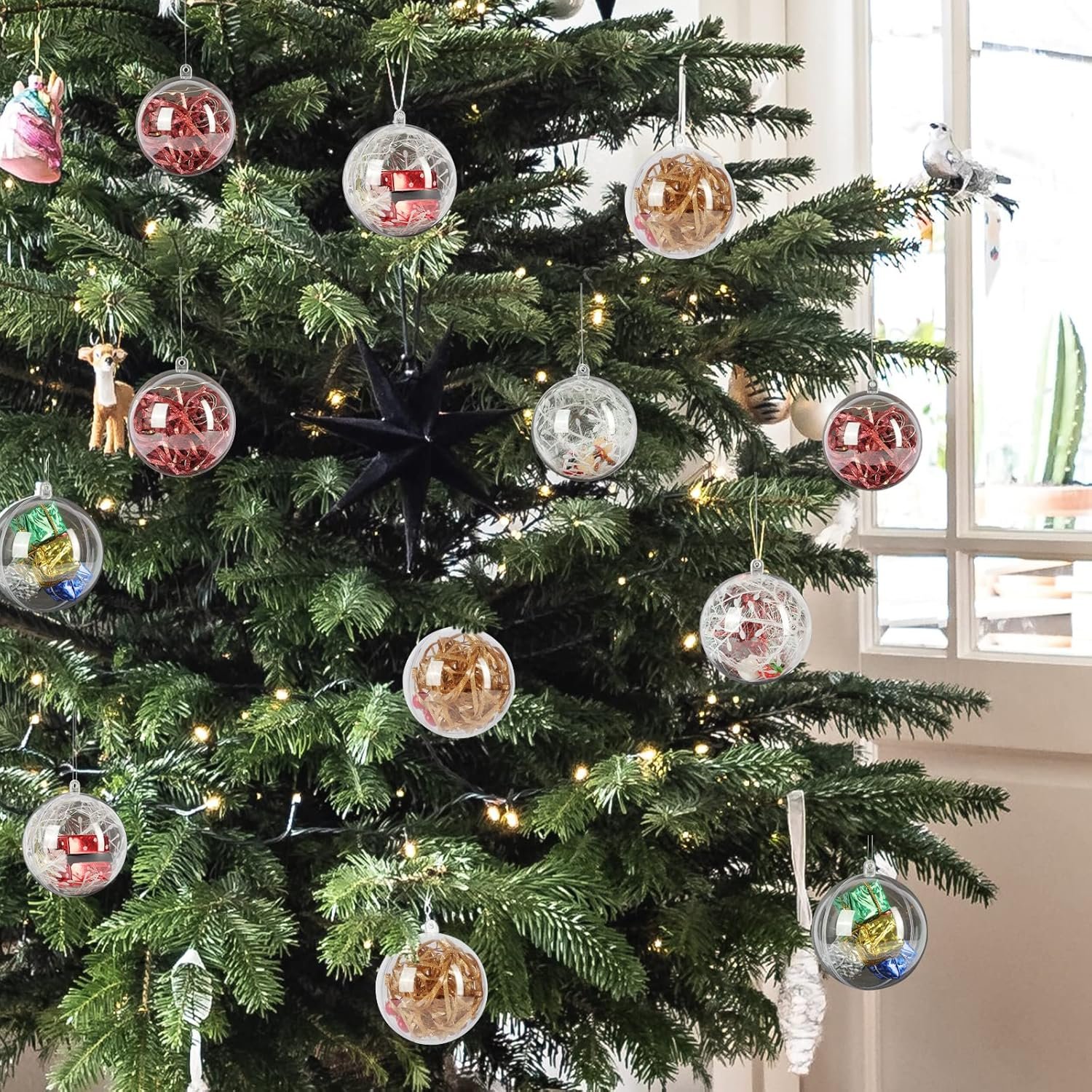 FILLABLE ORNAMENTS BALLS:Each clear fillable ball can be separated into two parts in order to open and put some small objects inside.Slip a piece of ribbon, twine, rope or wire through the loop to hang