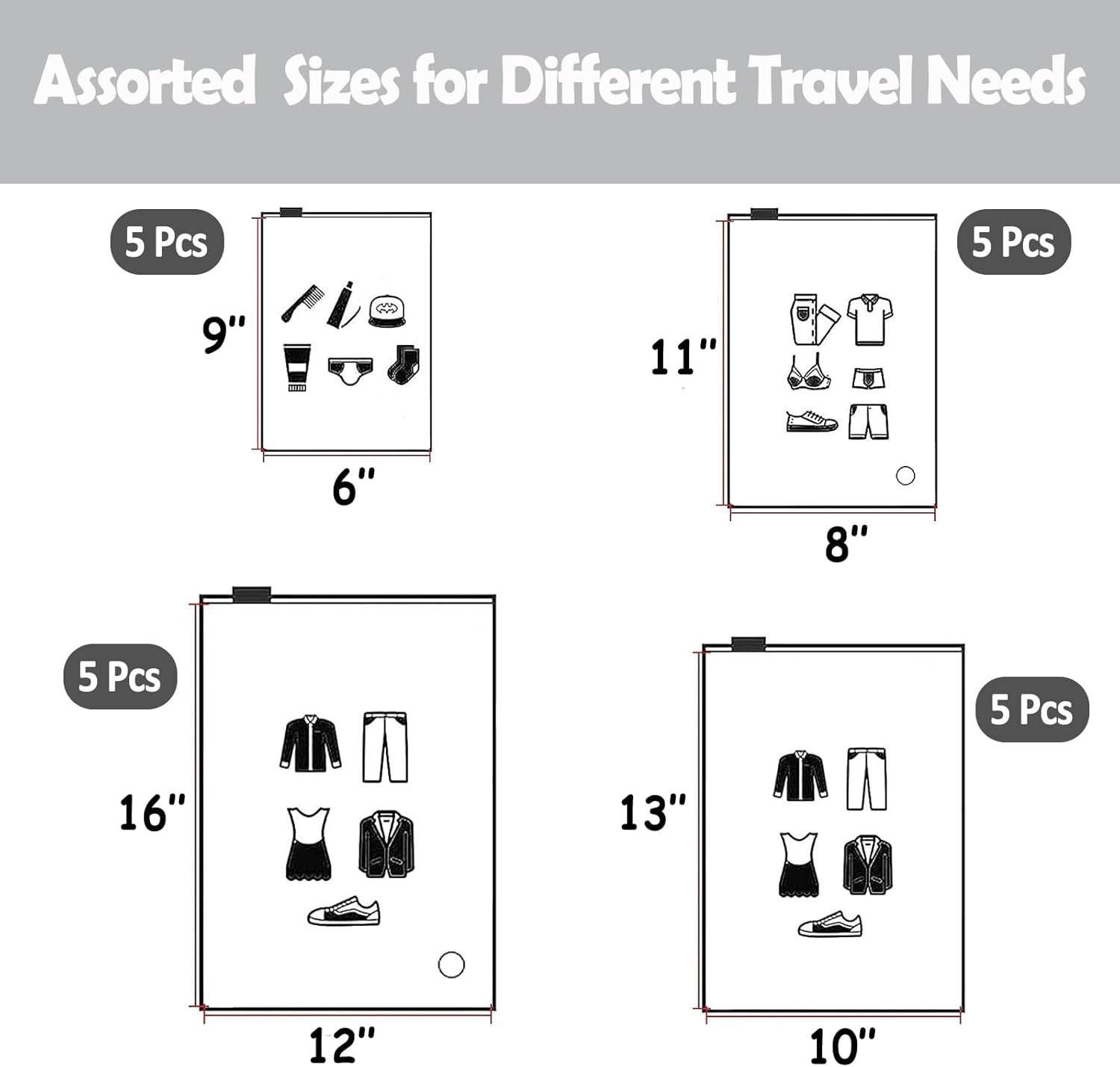 (20 pcs Value Pack) Travel Luggage Organizer Bags, Assorted Sizes, 4Mil Resealable Slider Zip Plastic Clothing Packaging, Frosted Travel/Home Storage and organizing Pouches, Space Saver Bag