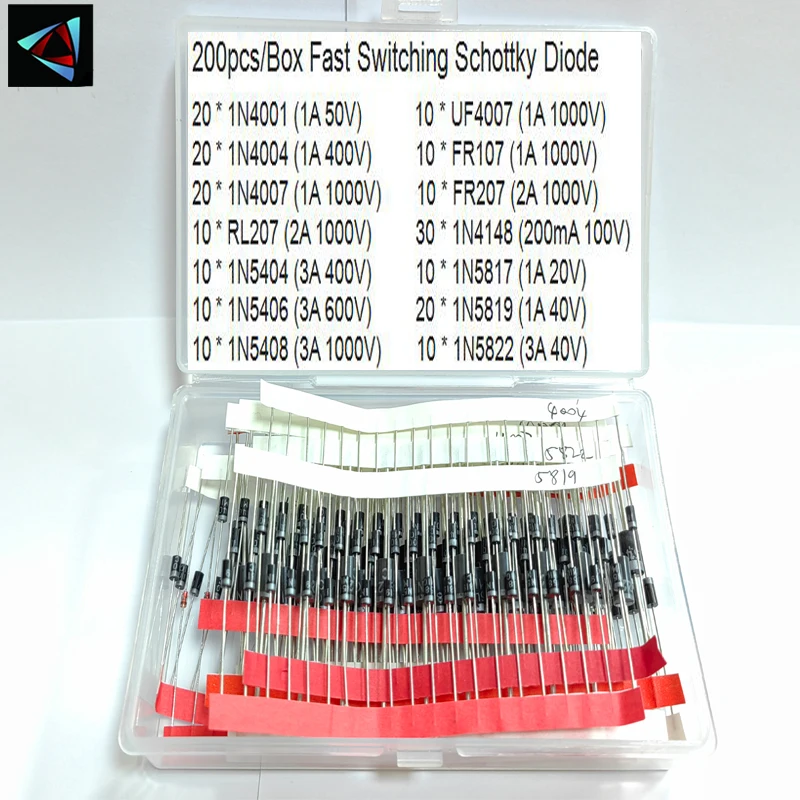 10 reviews for 200pcs/Box Fast Switching Schottky Diode Assorted Kit 1N4001 1N4004 1N4007 1N5408 UF4007 FR207 1N5817 1N5819 1N5822 1N4148 RL207