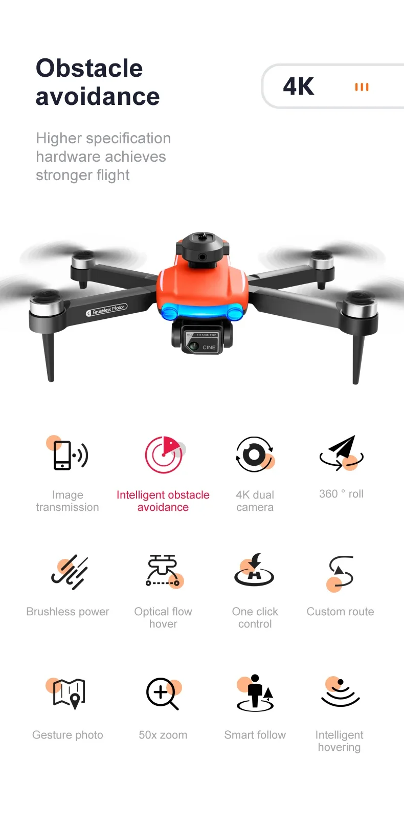 One click takeoff/one click landing/ascent/descent/left/right turn/360 ° roll/headless mode/fast/slow gear/photography/video recording/switching between dual cameras/facial recognition automatic photography/gravity sensing/trajectory flight/