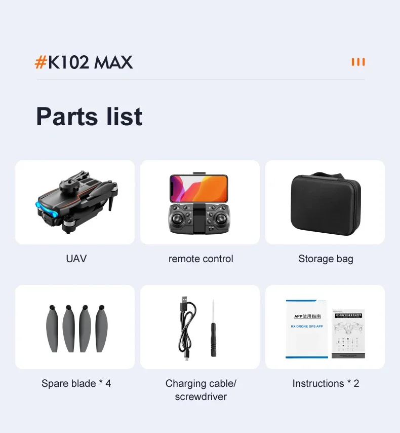Screwdriver * 1 spare fan blade * 4 drone manual * 1 APP manual * 1 storage bag * 1 color box * 1“
