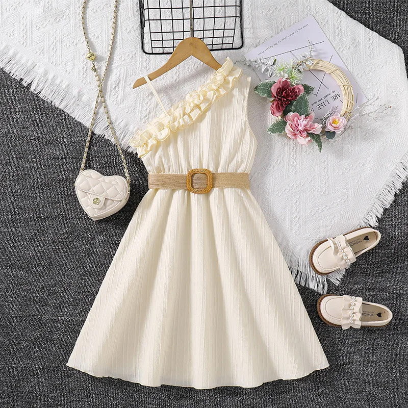 2024 New Summer Dress Pink White Sleeveless Skirt With Diagonal Lace &Belt Fashion Vacation Party Daily For 4-12Ys Kids Outfit