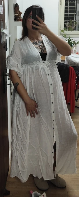 I love the dress, it’s very light and comfortable, i want to wear it all the time! The only thing that bothers me about the design is the choice of leaving the raw fabric from the front, it looks like a malfunction. Other than that, very recommended.