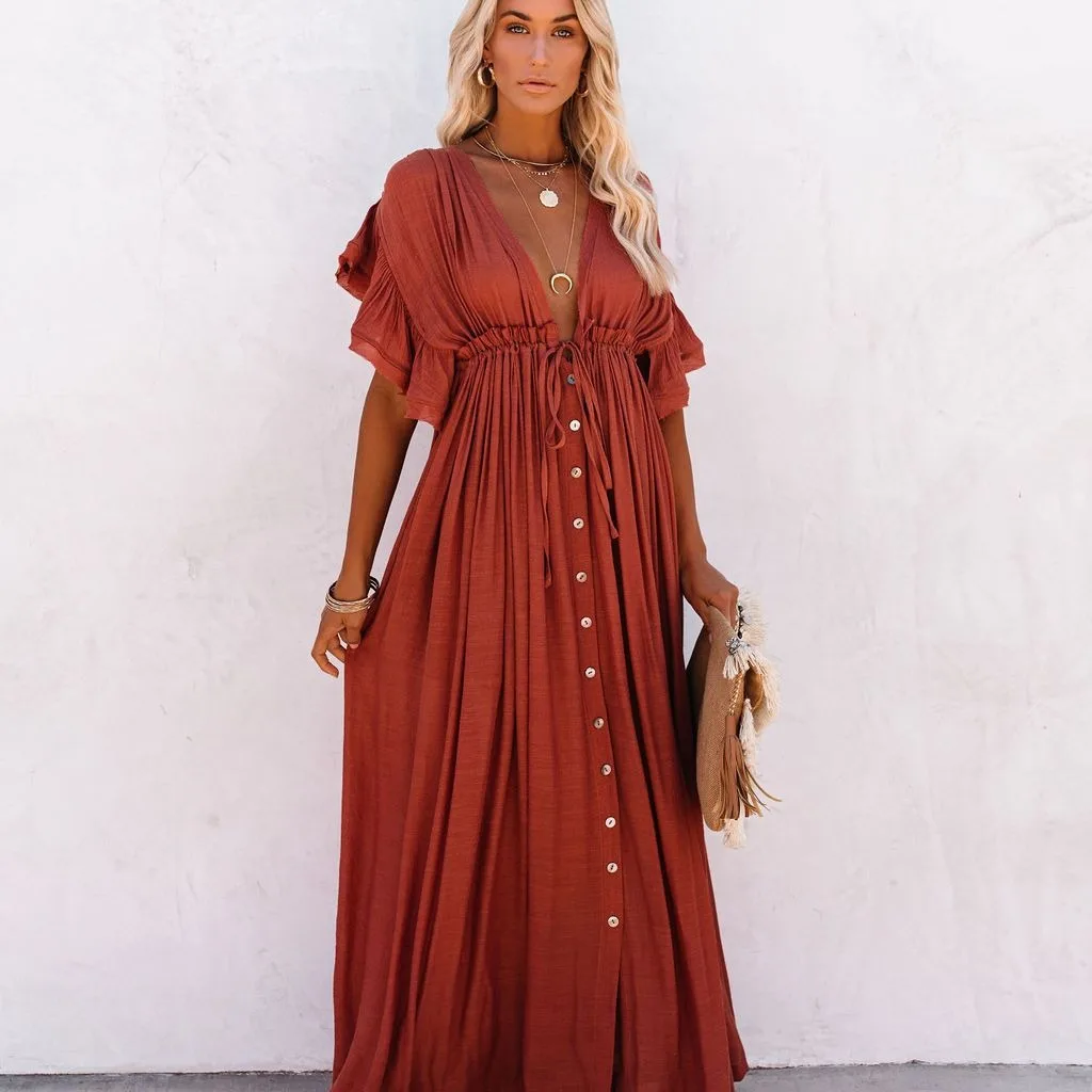 3 reviews for 2024 Summer Long Bikini Cover Ups for Women Solid V-Neck Kimono Beach Dresses Lace Up Anti-Sun Swim Dress Bohemian Sarong Skirt