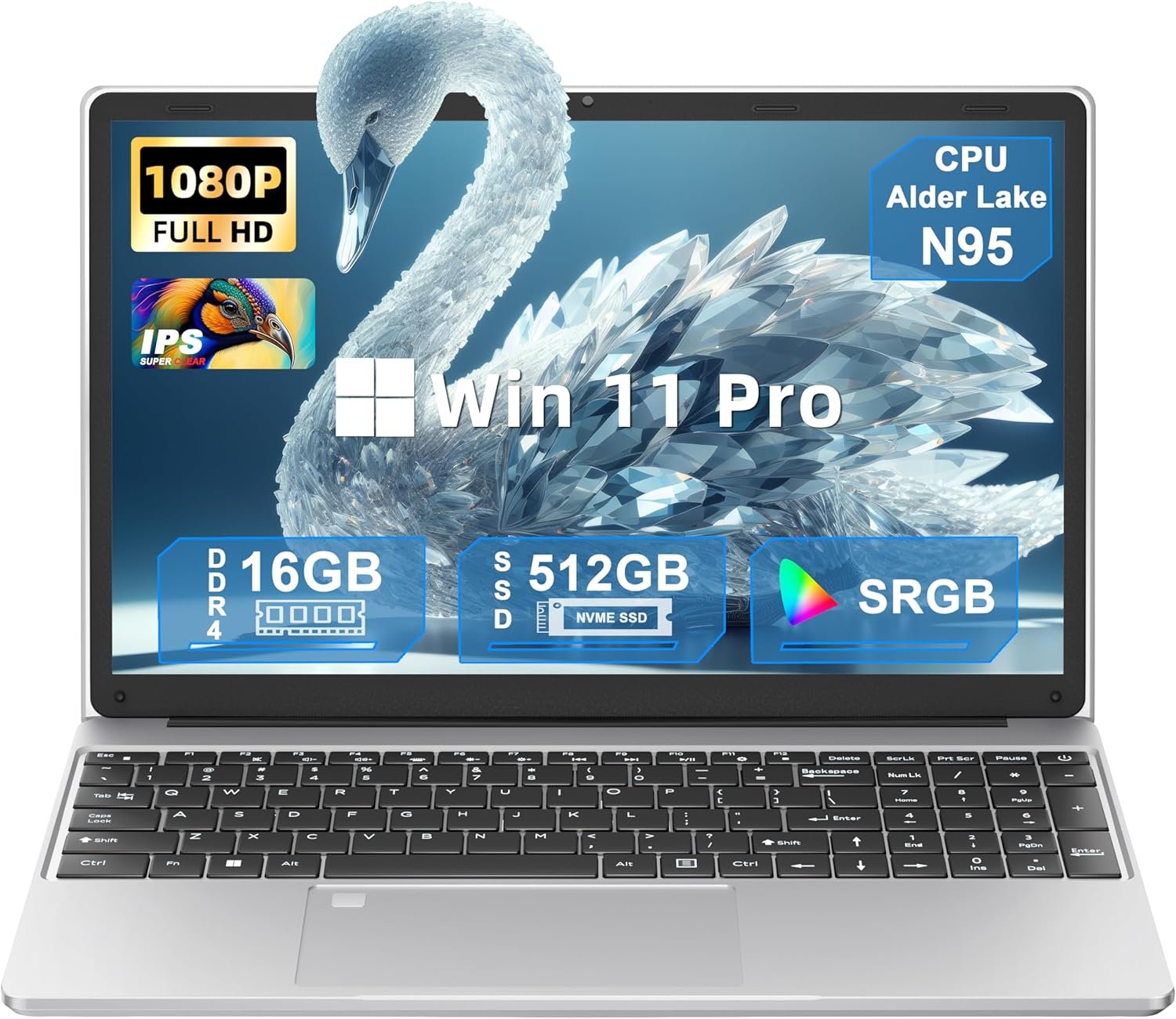 2025 15.6″ FHD IPS Business Laptop, Laptop with Alder Lake N95(Up to 3.4GHz),15.6-inch UHD IPS Display 16GB RAM 512GB NVMe SSD Win 11 Pro,5800mAh Battery,WiFi 5, Backlit KB,Fingerprint Sensor (Silver)