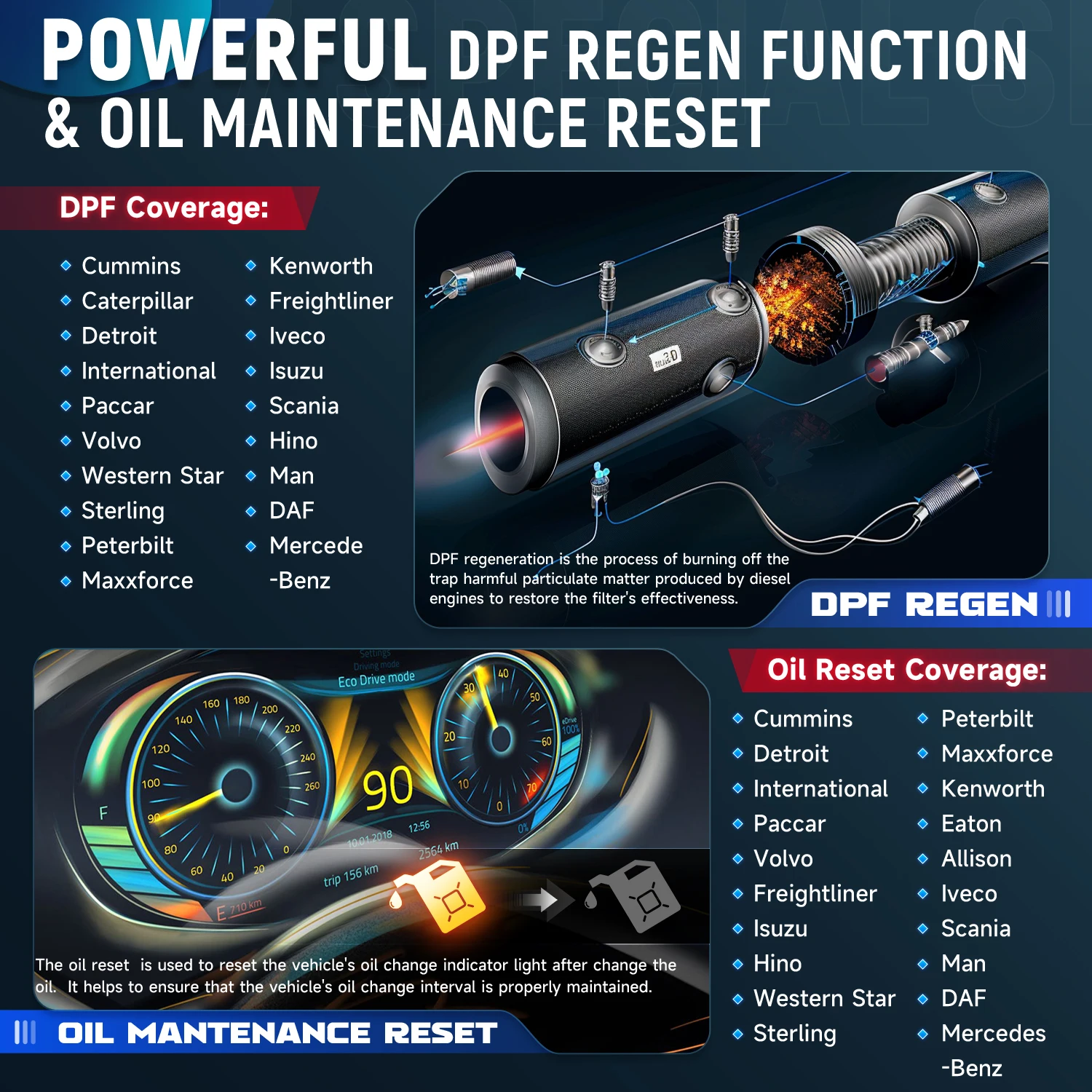 CRP129HD DPF function integrates monitoring, control, analysis, and fault diagnosis capabilities to ensure that the DPF system can operate effectively under various operating conditions. It is suitable for over 50 engine models including Cummins Caterpillar Detroit International Paccar Volvo Peterbilt. Remote diagnosis will send diagnostic/feedback reports to remote systems or service centers, which will provide professional advice for your vehicle.