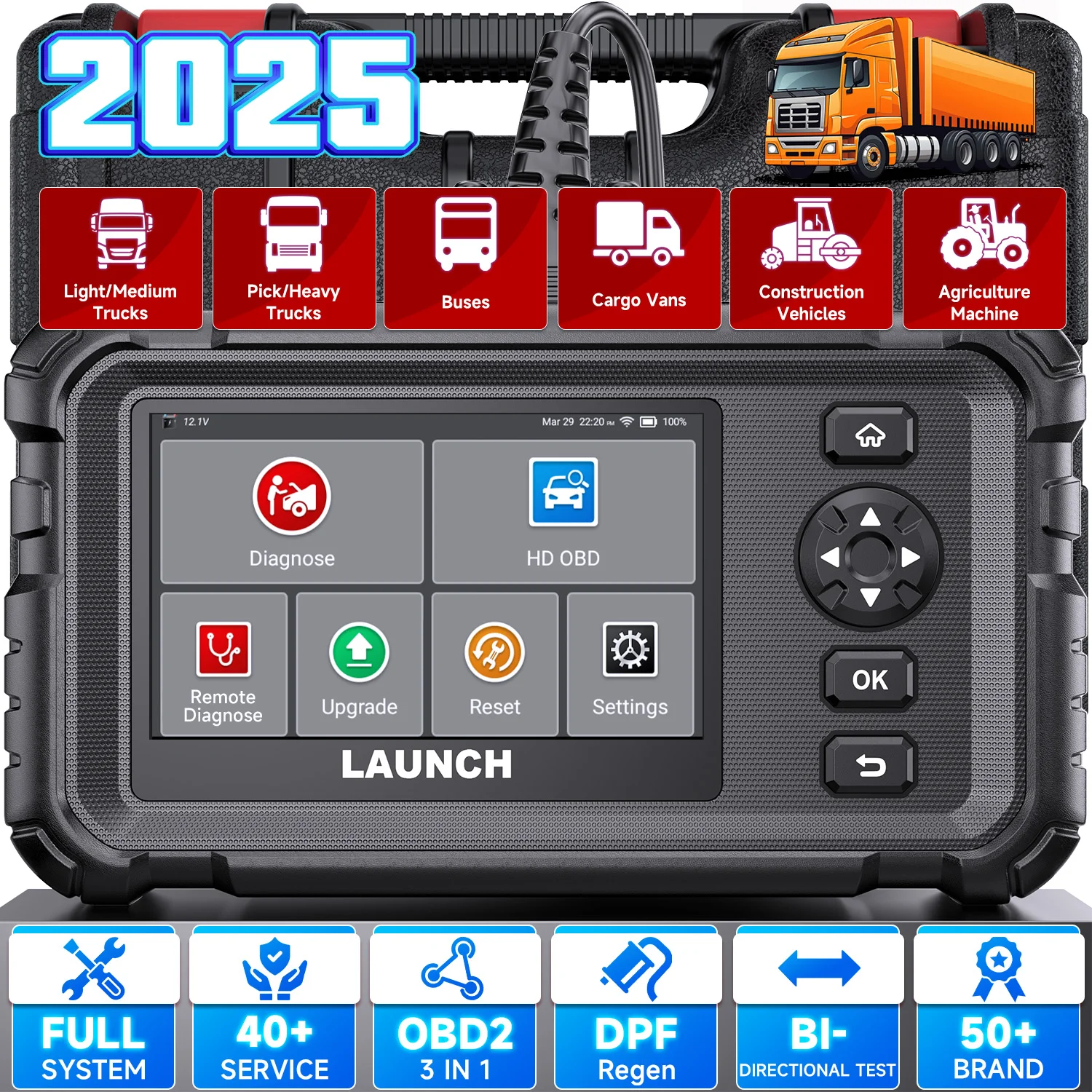 Launch 129HD diesel truck OBD2 scanner designed specifically for commercial vehicles, including 7+special services provided for mechanics for daily maintenance of vehicles in the workshop, such as DPF Regen, oil reset, speed limit adjustment, ABS deflation, injector coding, compression disabled cylinder, advanced data ECM, ABS controller reset, Set parameters, etc.