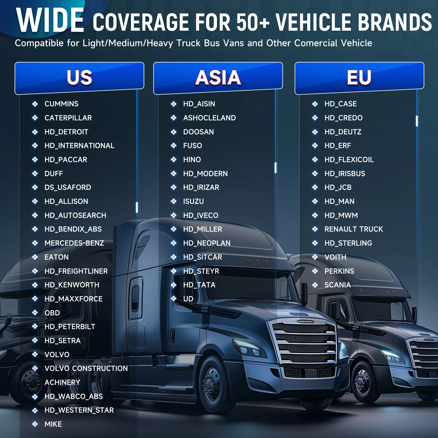 for Cummins, for Caterpillar, for Detroit, for International, for Paccar, for Volvo, for Freight, for Kenworth, for Isuzu, for Hino, for Westinghouse, for Pound, for Peterbilt, for Maxfos, for Peterbilt, for Maxfos, for Scania, for MAN, for Dove, for Mercedes Benz, for Usaford, for Aisin, for Alison, for Case, for Credo, for Deutsche, etc.