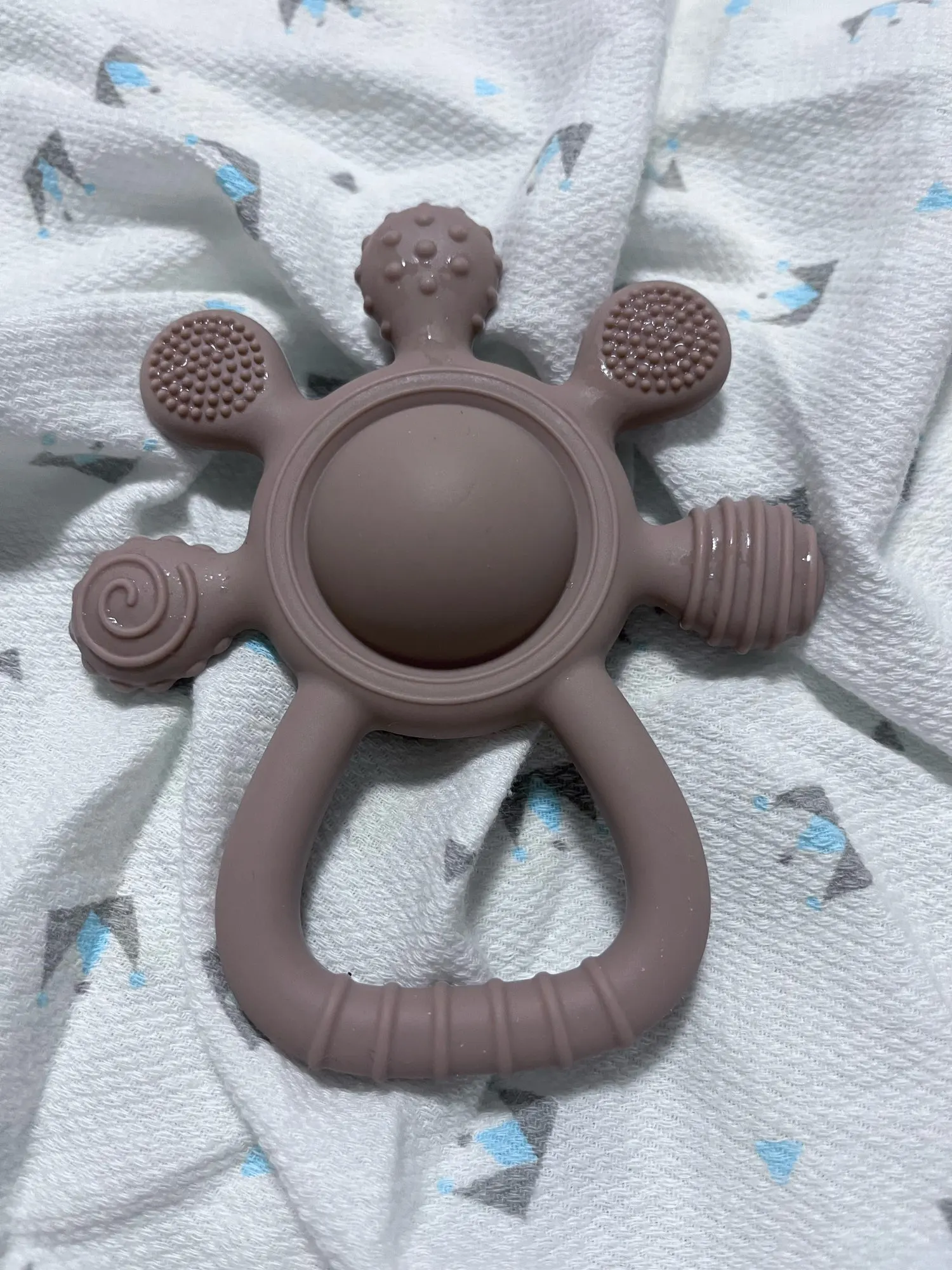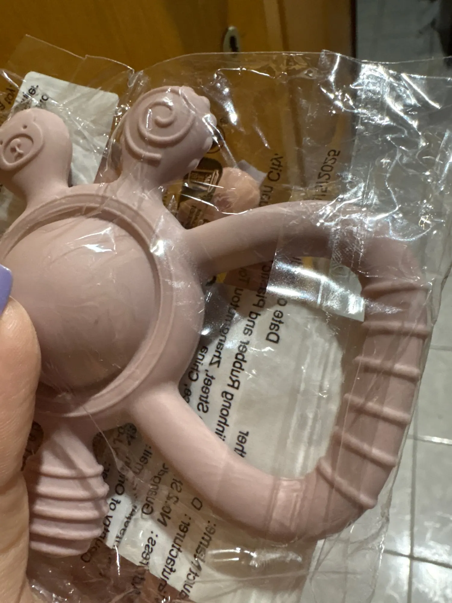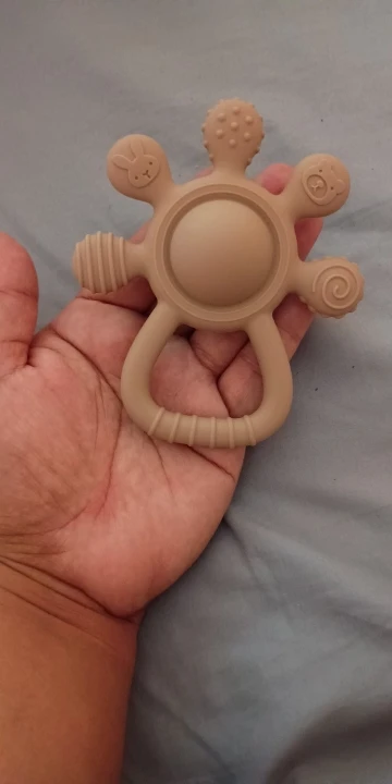 Cute teether. It’s a little bit heavy because it’s solid but it seems like it will be a great teether for the baby