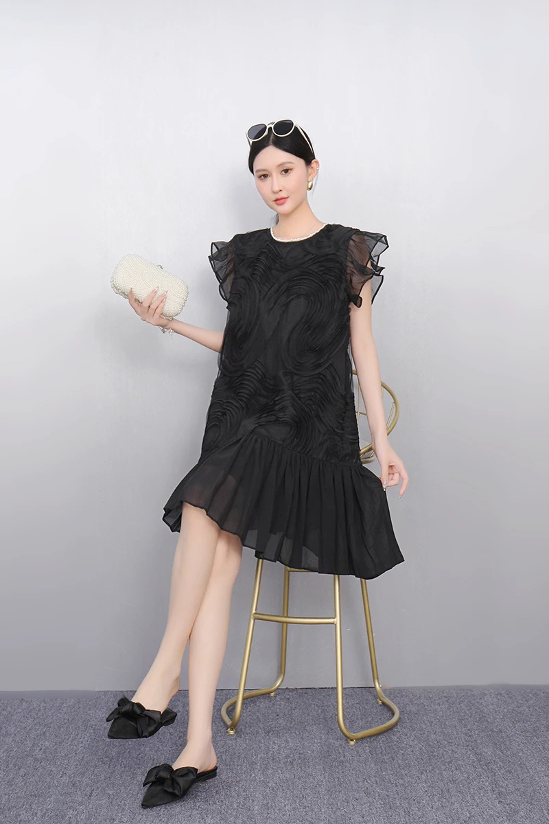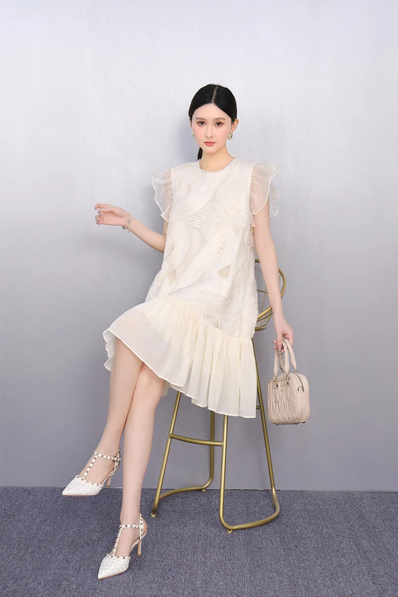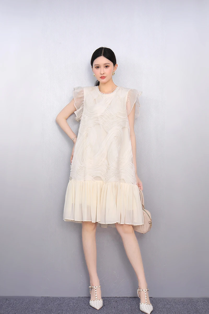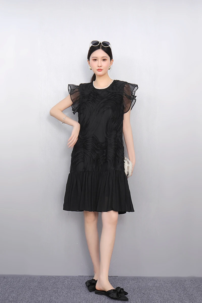 2025 Spring Summer Fashion Elegant O-Neck Mesh Loose Long Dresses Women Short Sleeve Dress Ladies J1089