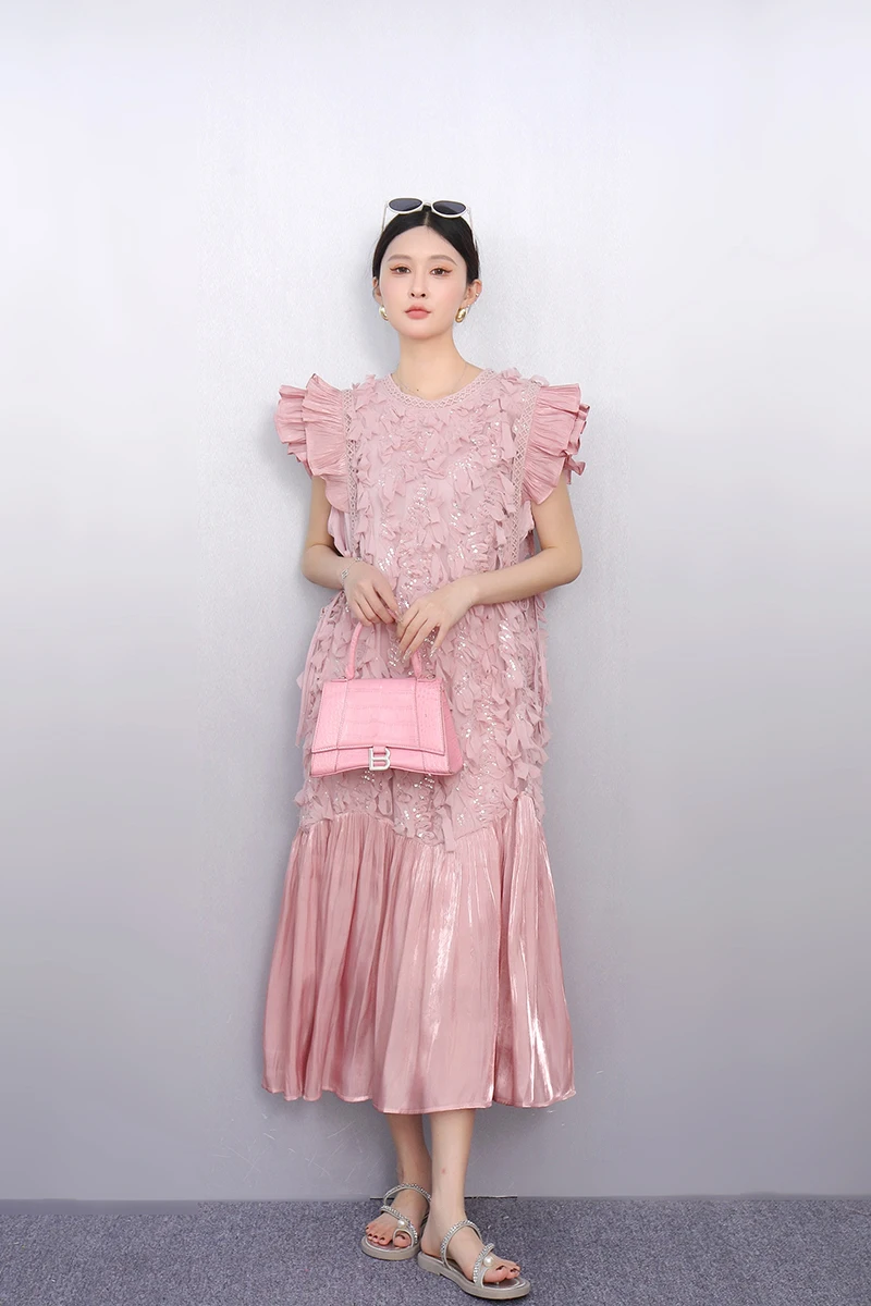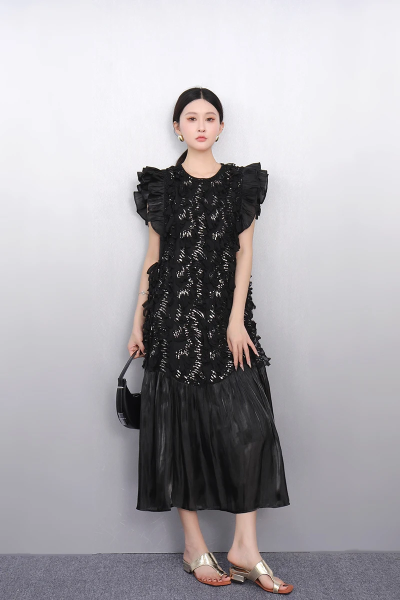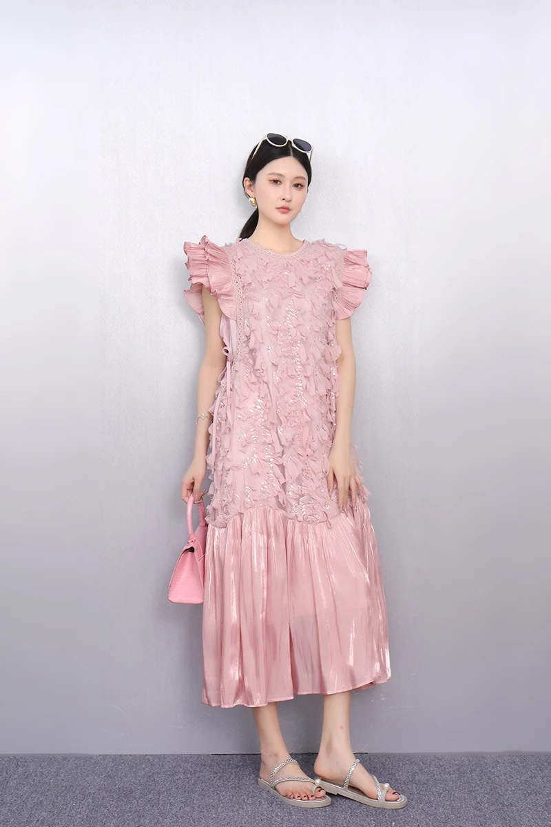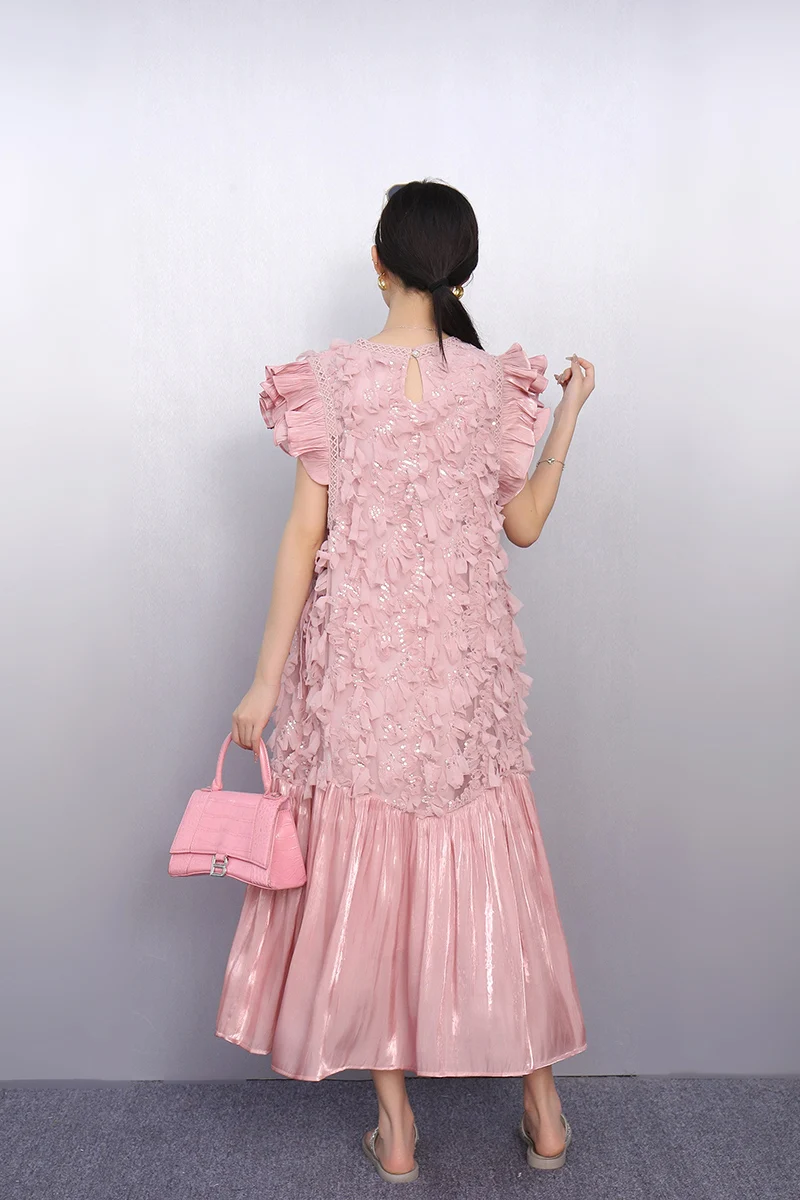 2025 Summer Fashion Elegant Loose Mesh Ruffle Edge Long Dresses Women Short Sleeve Dress Ladies J1102
