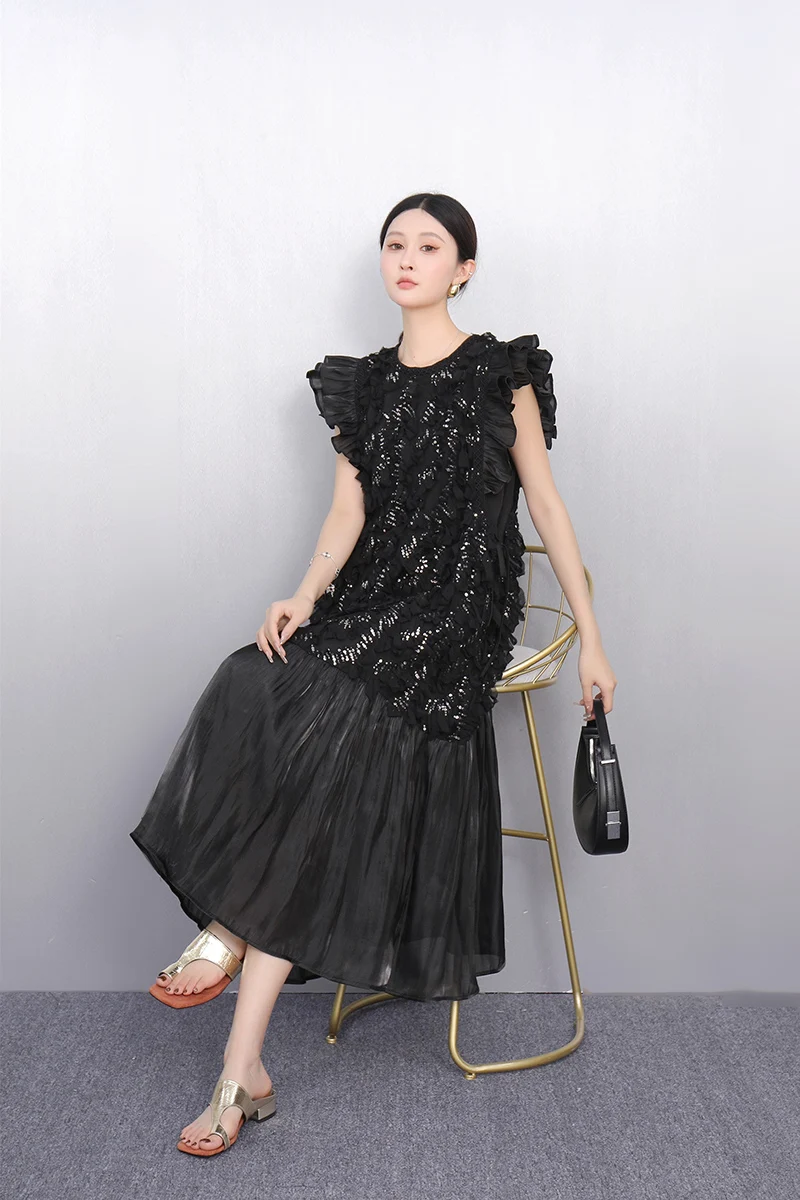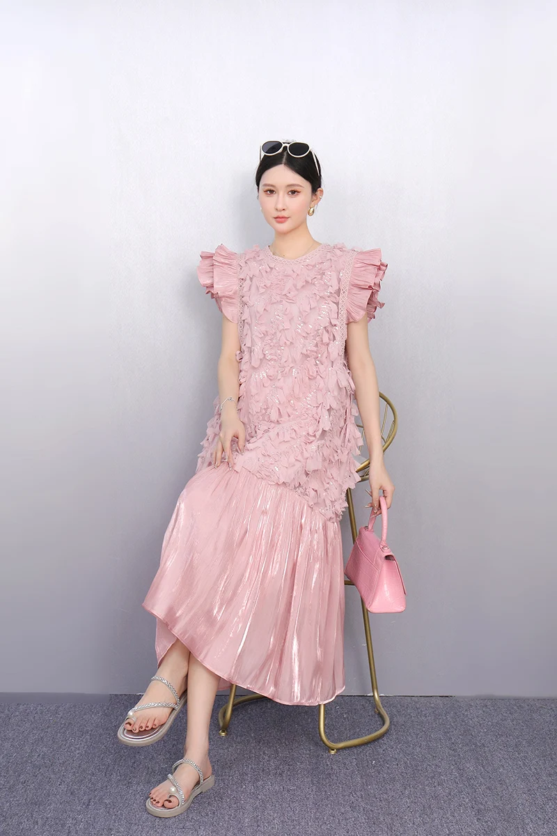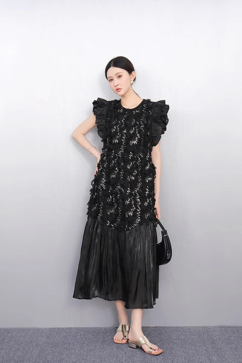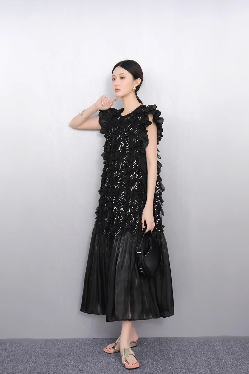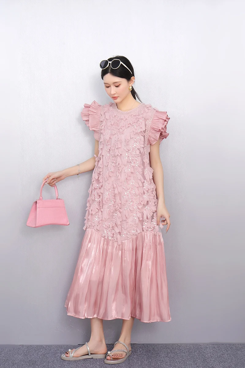 2025 Summer Fashion Elegant Loose Mesh Ruffle Edge Long Dresses Women Short Sleeve Dress Ladies J1102
