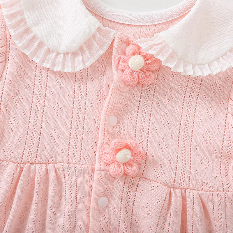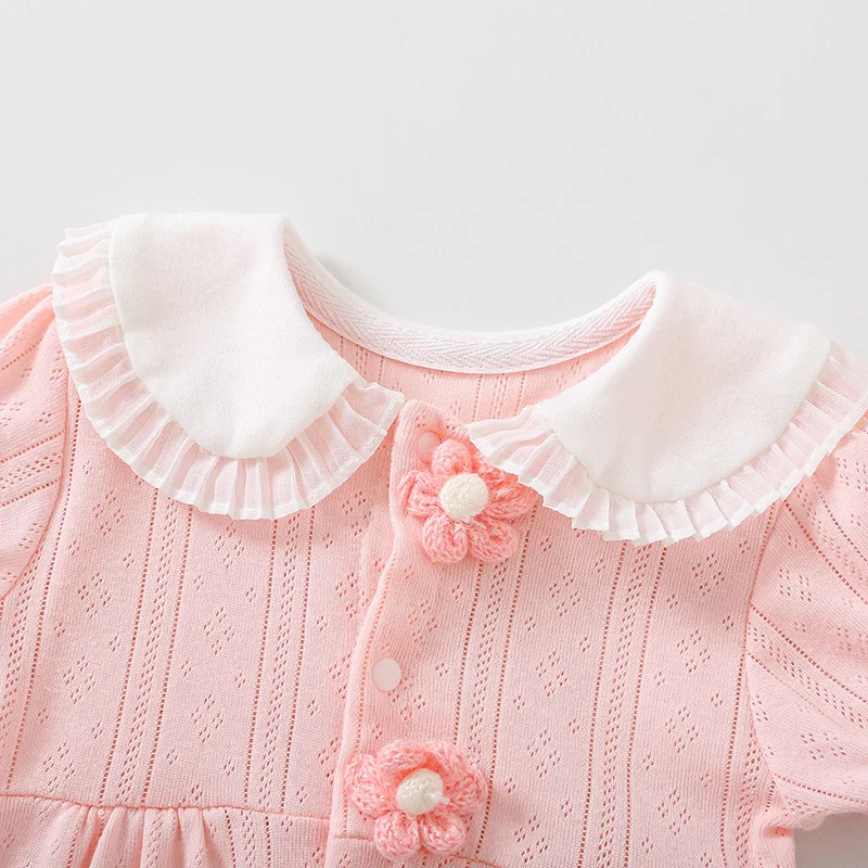 Showcases a lovely pink shade, a classic doll collar, and ruffled cuffs, exuding princess charm. Flower-patterned buttons add a sweet, eye-catching detail.