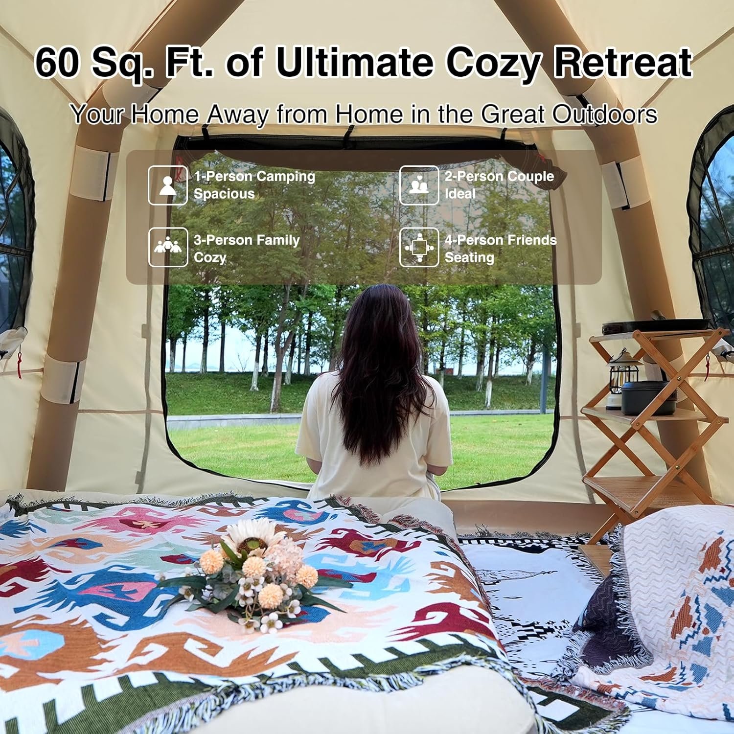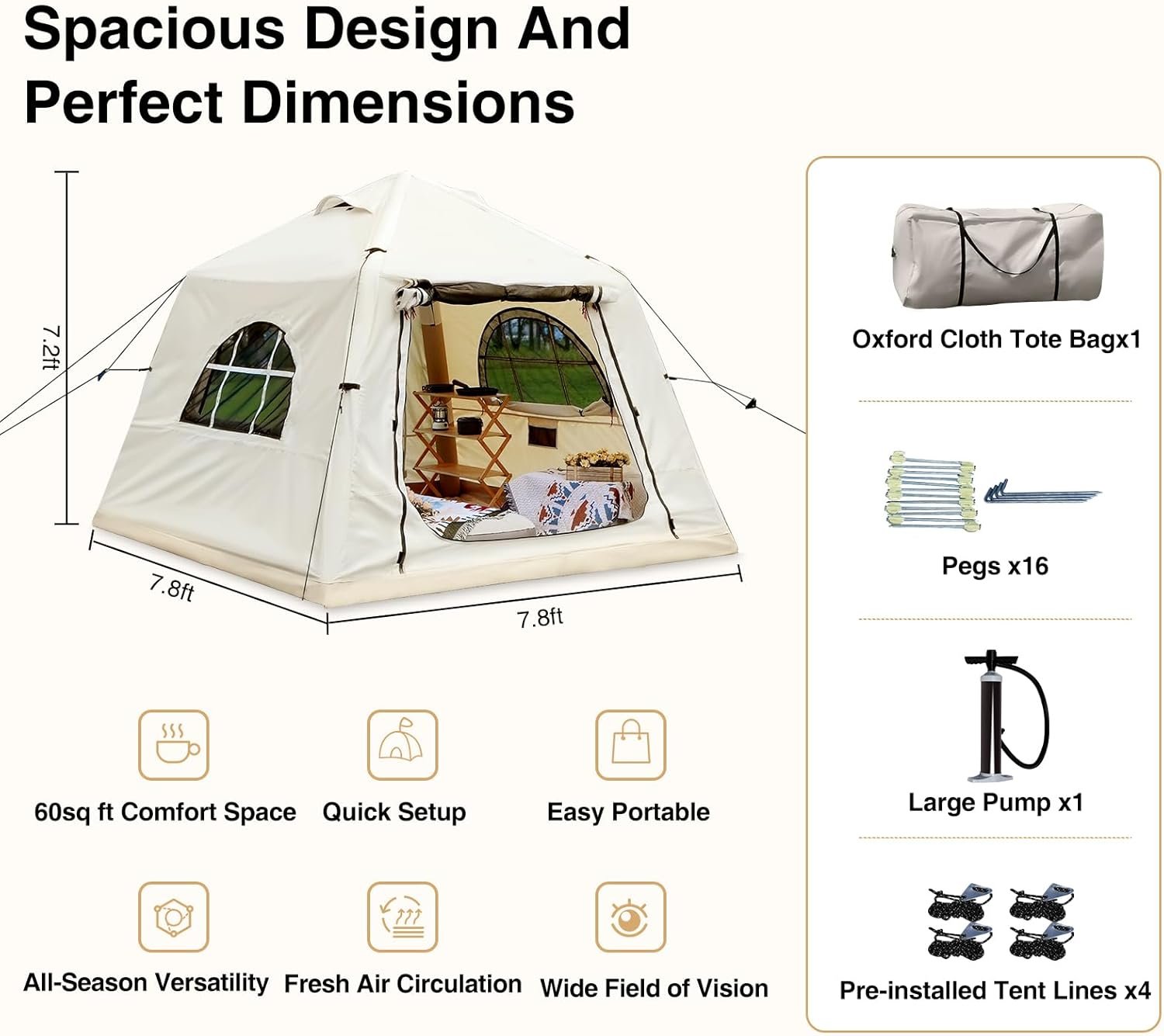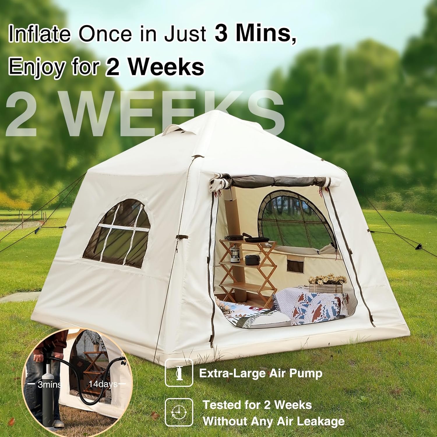 Set Up in 3 Mins: Say goodbye to the hassle of traditional tent setup! Our inflatable glamping tent can be effortlessly inflated in just minutes using the included air pump, no worries about missing or damaged parts