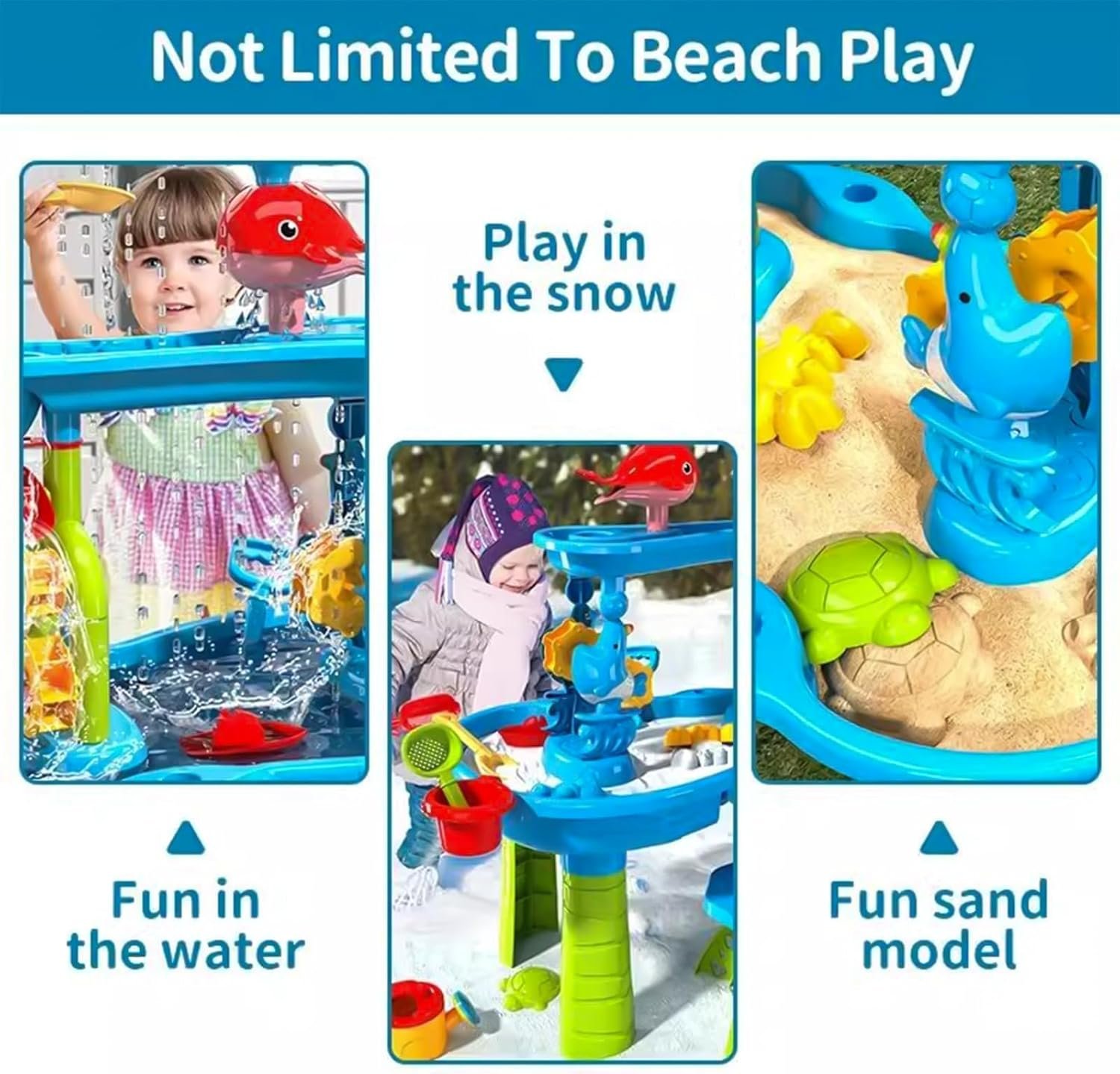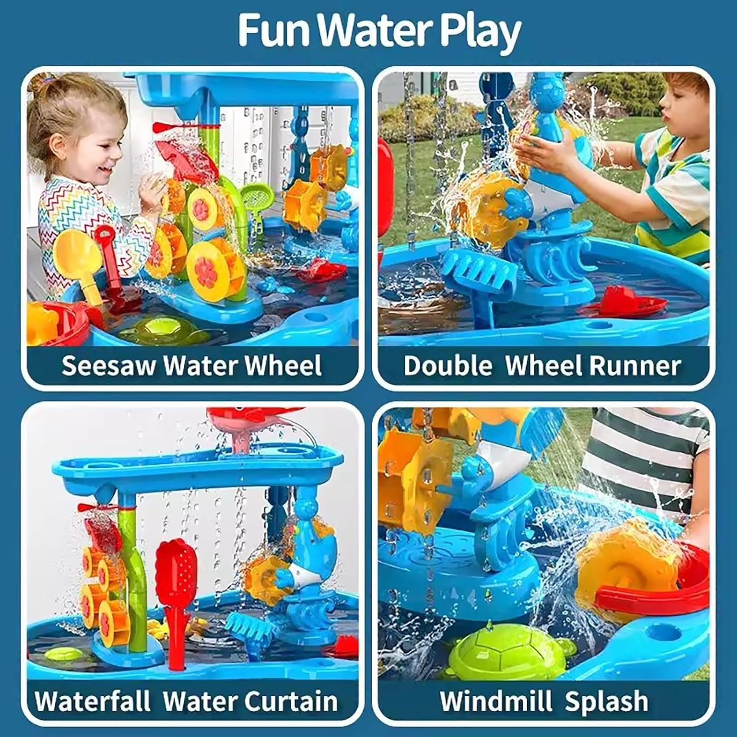 Diverse Play Experiences – This versatile sand and water table offers children a variety of engaging activities. They can pour water to create cascading effects, use molds to craft animal shapes, and explore different materials like sand, snow, or soil. Whether in the backyard, at the beach, or by the poolside, kids can build their own miniature water park, sparking imagination and providing endless fun.