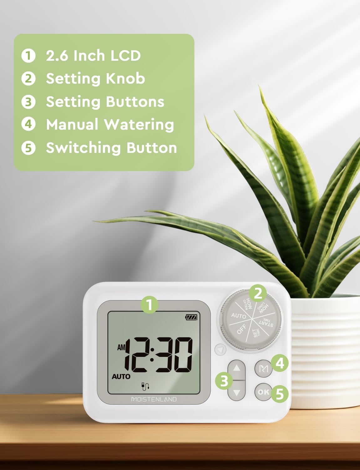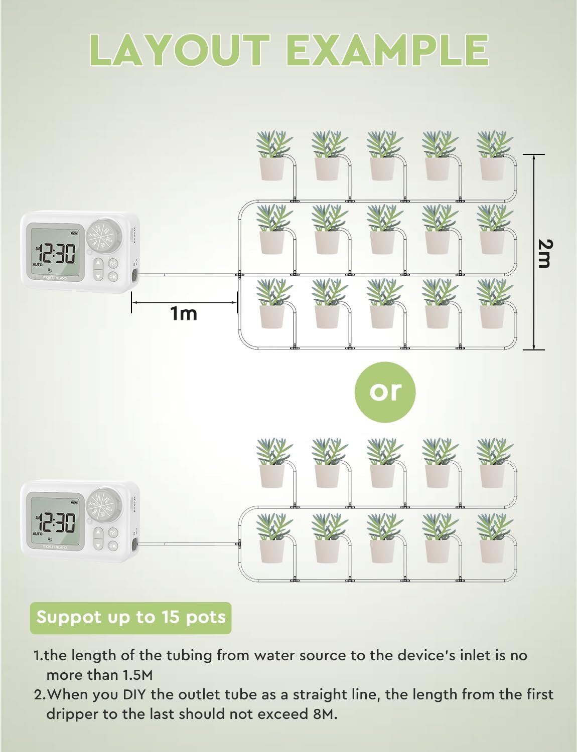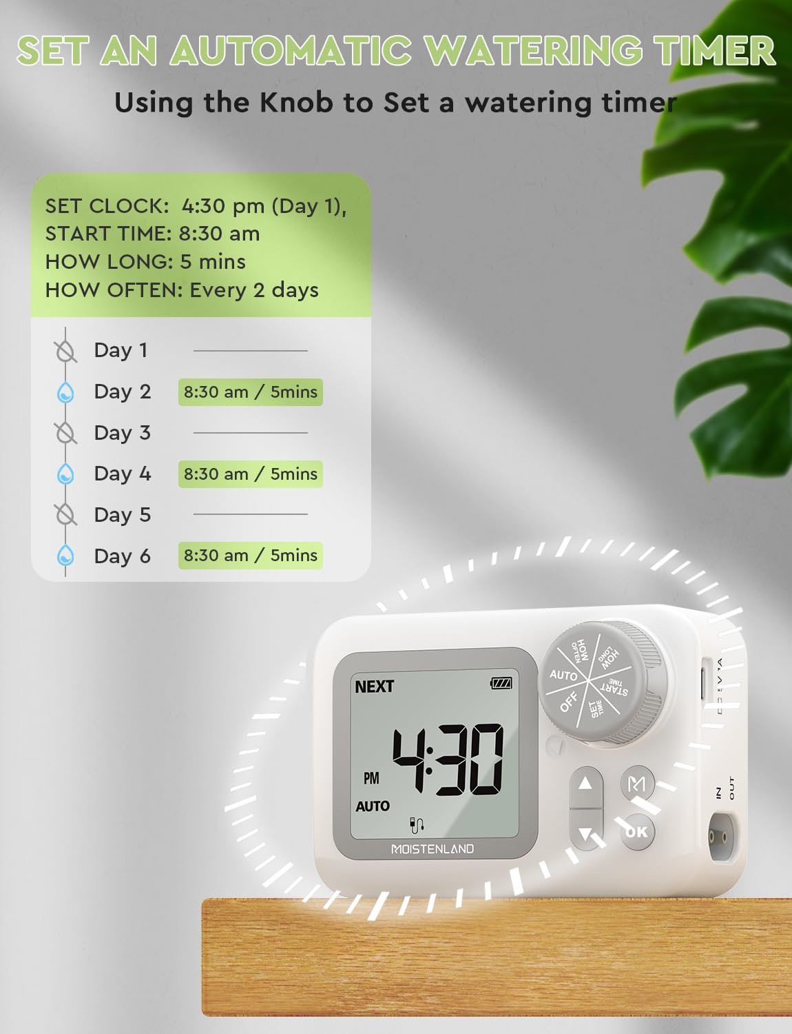 Customizable Watering Schedules: Moistenland drip irrigation kits come with timers that allow you to set specific watering schedules. You can program the system to water your plants at the optimal times, even when you’re not around. What’s more, with internal clock, you can set a when you want to start to watering plants.