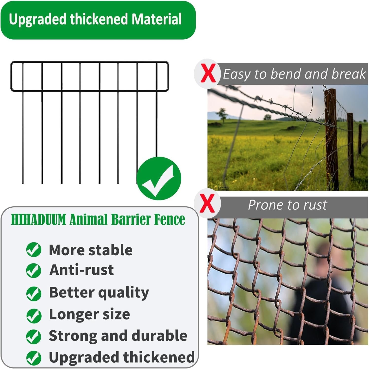 Upgraded thickened design:The animal barrier fence is welded with upgraded thickened steel, make it strong and not easy to bend. The upgraded design increases stability and prevents it from falling due to animal attack or bad weather.