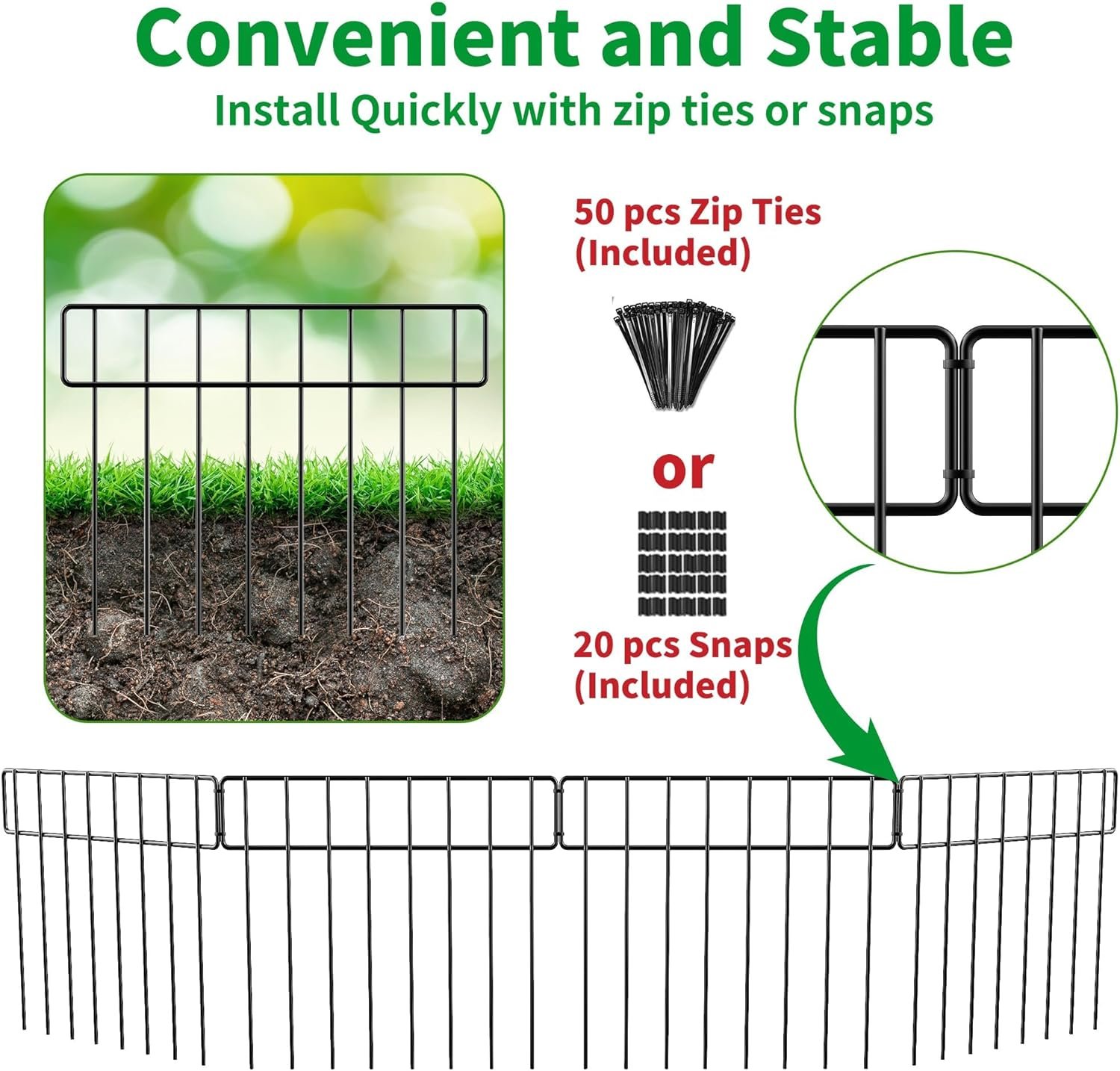 Easier to install: Compared to other single fence installation methods, our no dig fence panels have more installation options. You can choose zip ties (included) or self-locking snaps (included) to install. Recommended to use zip ties&self-locking buckles together to make your fence more stable, prevent it from falling and becoming fragile when attacked by animals.