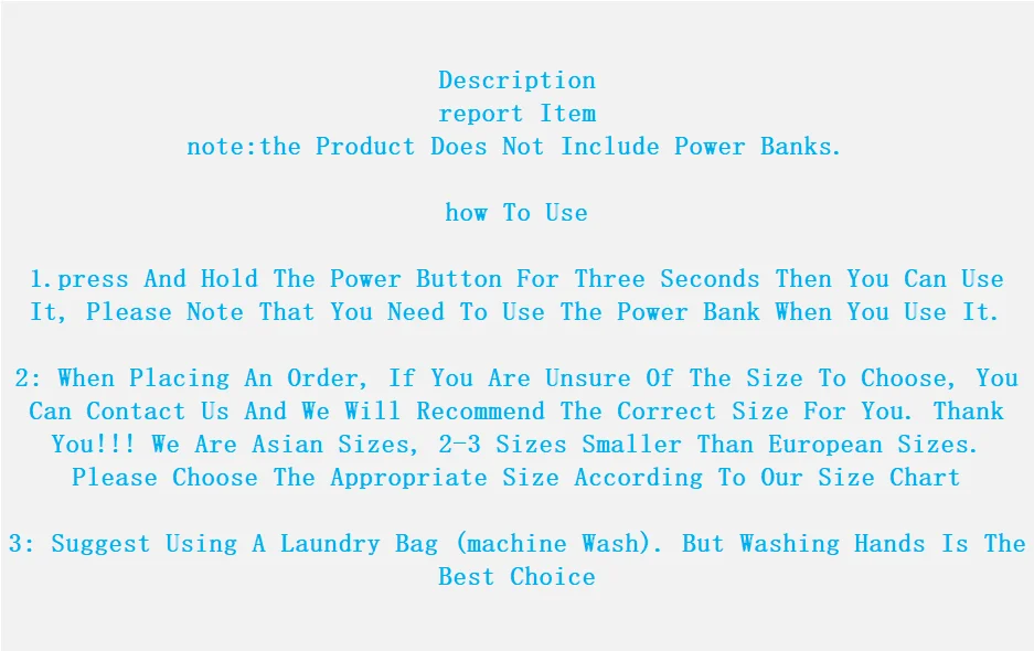 Hello, the correct way to turn it on is to long press and hold the switch for 3-5 seconds until the light is on before releasing it. After the switch lights up, press the three gears and release them. Different colors have different temperatures. If you have any questions or suggestions, please contact us promptly and we will do our best to help you solve the problem Explanation: The size labels on the received clothes are all Asian sizes.