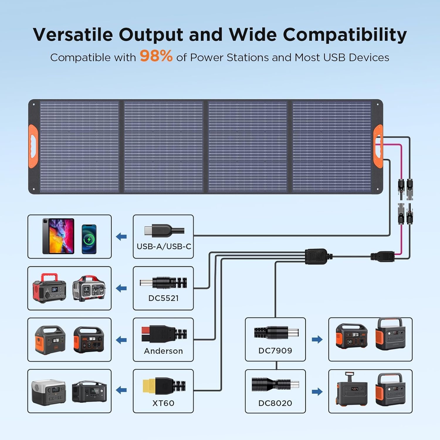 【Versatile Output and Wide Compatibility】220W portable solar panel comes with a controller which is equipped with 3 versatile interfaces to meet all your charging needs. The solar interface can seamlessly connect to our complimentary 10ft solar cable (XT60/ANDERSON/DC5521/DC7909), ensuring compatibility with 95% of power stations available in the market. 1*Black USB-A(5V/3A), 1*Orange USB-A(12V/1.5A) , 1*Type-C(15V/3A) can charge USB devices like phones, tablets, laptops etc